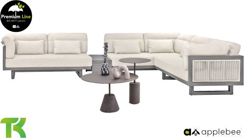 Apple Bee Santorini Lounge Rope: Wenn Sie eine elegante, kubistische Lounge-Garnitur lieben, aber dennoch Wert auf Individualität legen, dann ist die Santorini genau das Richtige für Sie! Ein schlankes, quadratisches Aluminiumrohrgestell, pulverbeschichtet in warmem Taupe. Diese Garnitur ist in zwei Ausführungen erhältlich. Der Unterschied liegt in den Paneelen an Armlehnen und Rückenlehne, die wie ein Gemälde vom Gestell eingerahmt werden. Bei der ersten Ausführung sind die Paneele mit einem wunderschönen, melierten Seil umwickelt. Dies verleiht der Garnitur eine luftige und zugleich moderne Optik. Die zweite Ausführung besticht durch gepolsterte Paneele im gleichen Stoff wie die Kissen und verleiht ihr so einen Hauch von Klasse und Luxus.