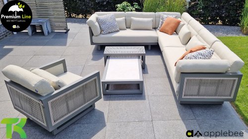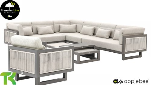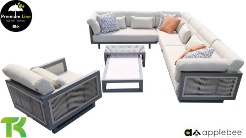 Apple Bee Santorini Lounge Rope: Wenn Sie eine elegante, kubistische Lounge-Garnitur lieben, aber dennoch Wert auf Individualität legen, dann ist die Santorini genau das Richtige für Sie! Ein schlankes, quadratisches Aluminiumrohrgestell, pulverbeschichtet in warmem Taupe. Diese Garnitur ist in zwei Ausführungen erhältlich. Der Unterschied liegt in den Paneelen an Armlehnen und Rückenlehne, die wie ein Gemälde vom Gestell eingerahmt werden. Bei der ersten Ausführung sind die Paneele mit einem wunderschönen, melierten Seil umwickelt. Dies verleiht der Garnitur eine luftige und zugleich moderne Optik. Die zweite Ausführung besticht durch gepolsterte Paneele im gleichen Stoff wie die Kissen und verleiht ihr so ​​einen Hauch von Klasse und Luxus.