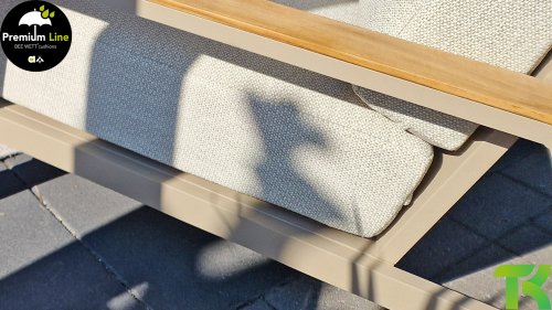 Ein strenges diagonales Linienmuster, sorgfältig verarbeitetes Aluminium, pulverbeschichtet in einer schönen Latte Farbe und weiche, komfortable Kissen in sandfarbenem Stoff. Ein Hauch von Teak auf der Lehne rundet das Set ab und verleiht ihm das gewisse Extra-Detail. Mit einer Dekoration in Ihrem eigenen Stil können Sie im Handumdrehen Ihren eigenen Dreh an diesem 'Sonnennest' geben.