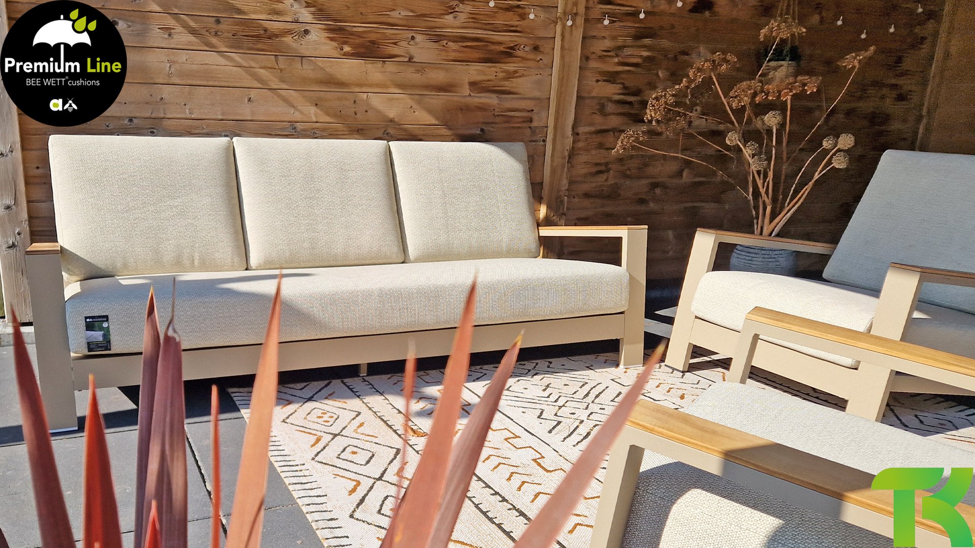 Die Apple Bee Spring Aluminium Latte Kollektion ist minimalistisch und sauber, aber fällt dennoch durch eine besondere Gestaltung auf. Ein strenges diagonales Linienmuster, sorgfältig verarbeitetes Aluminium, pulverbeschichtet in einer schönen Latte Farbe und weiche, komfortable Kissen in sandfarbenem Stoff. Ein Hauch von Teak auf der Lehne rundet das Set ab und verleiht ihm das gewisse Extra-Detail. Mit einer Dekoration in Ihrem eigenen Stil können Sie im Handumdrehen Ihren eigenen Dreh an diesem 'Sonnennest' geben.