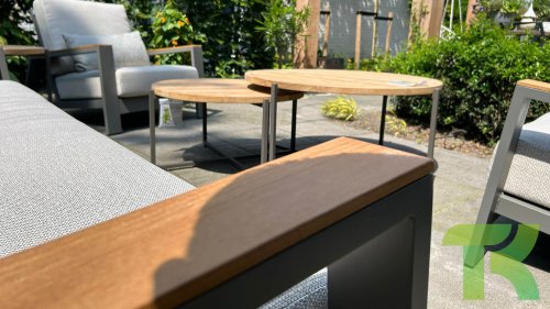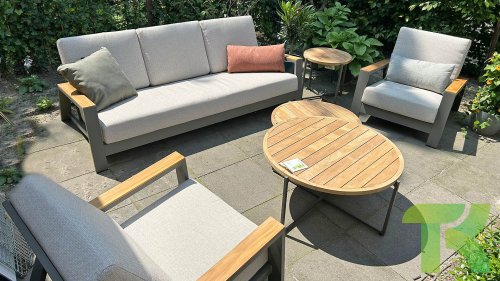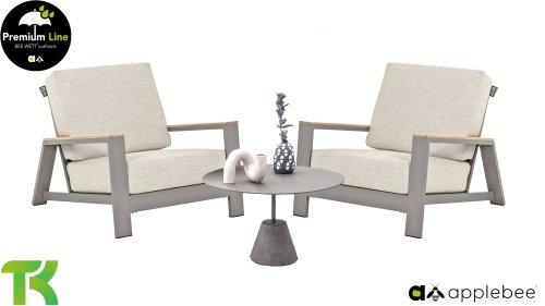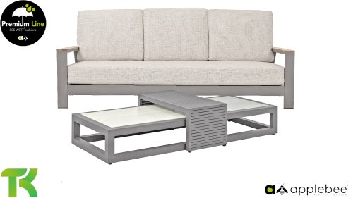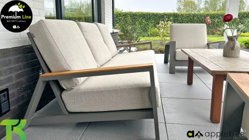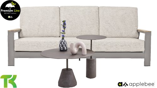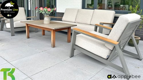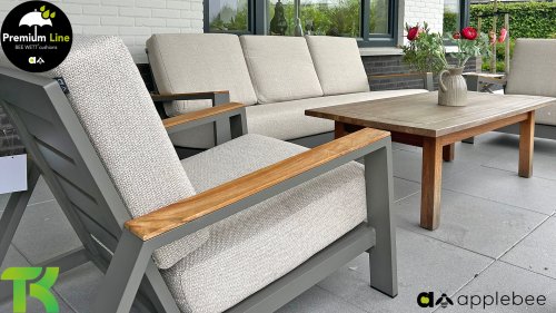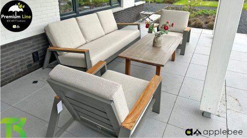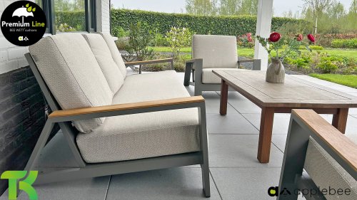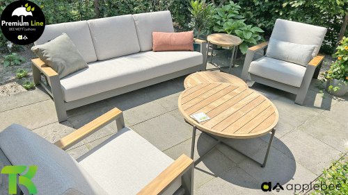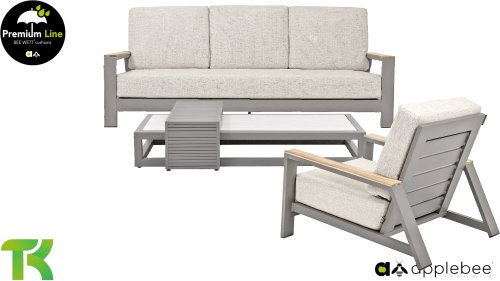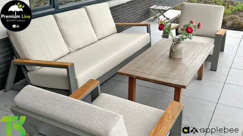 Die Spring-Aluminiumkollektion ist minimalistisch und klar, fällt aber dennoch durch ihr besonderes Design ins Auge. Eine schlanke diagonale Linie, fachmännisch verarbeitetes Aluminium, pulverbeschichtet in einem wunderschönen Taupe-Farbton und weiche, bequeme Kissen mit sandfarbener Polsterung. Ein Hauch von Teakholz an der Rückenlehne rundet das Set ab und verleiht ihm das gewisse Extra. Mit einer Dekoration in Ihrem eigenen Stil können Sie diesem „Nest in der Sonne“ im Handumdrehen eine ganz persönliche Note verleihen. Kombinieren Sie das Set mit dem Santorini- oder Lisa-Couchtisch oder wählen Sie einen der anderen Apple Bee-Tische. Lass den Frühling kommen!