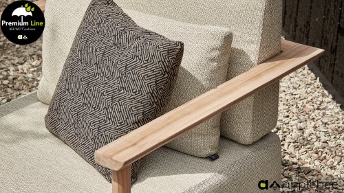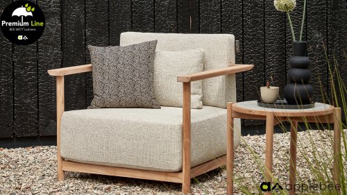 Apple Bee St. Lucia Teak Lounge: Wie luxuriös möchten Sie die Kissen Ihrer Loungeset haben? Die St. Lucia Teak Lounge hat Sitzkissen von beeindruckenden 25 cm Dicke, natürlich in der Apple Bee Bee Wett Qualität. Trotzdem, dass Sie es vielleicht nicht erwarten, trocknen diese Kissen auch wesentlich schneller als Kissen mit Standardschaum. Durch die extrem dicken Kissen erhält die St. Lucia sofort ein sehr luxuriöses Aussehen, bleibt aber durch die klare Form und Stabilität zeitgemäß. Dies liegt natürlich auch am Rahmen aus hochwertigem SVLK-Teakholz in natürlicher Farbe. Die runden Beine gehen elegant in eine geschmackvoll geformte Lehne über, die von der Armlehne über den Rücken verläuft und Sie sozusagen umarmt. St. Lucia ist robust und gleichzeitig raffiniert in den richtigen Proportionen!