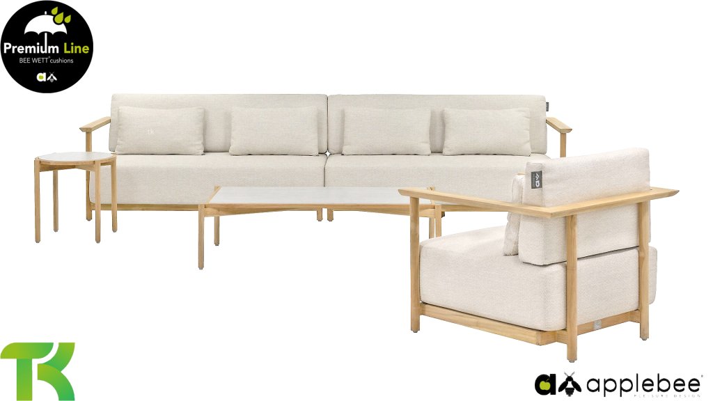 Apple Bee St. Lucia Teak Lounge: Wie luxuriös möchten Sie die Kissen Ihrer Loungeset haben? Die St. Lucia Teak Lounge hat Sitzkissen von beeindruckenden 25 cm Dicke, natürlich in der Apple Bee Bee Wett Qualität. Trotzdem, dass Sie es vielleicht nicht erwarten, trocknen diese Kissen auch wesentlich schneller als Kissen mit Standardschaum. Durch die extrem dicken Kissen erhält die St. Lucia sofort ein sehr luxuriöses Aussehen, bleibt aber durch die klare Form und Stabilität zeitgemäß. Dies liegt natürlich auch am Rahmen aus hochwertigem SVLK-Teakholz in natürlicher Farbe. Die runden Beine gehen elegant in eine geschmackvoll geformte Lehne über, die von der Armlehne über den Rücken verläuft und Sie sozusagen umarmt. St. Lucia ist robust und gleichzeitig raffiniert in den richtigen Proportionen!