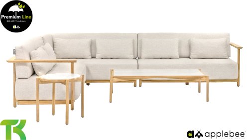 Apple Bee St. Lucia Teak Lounge: Wie luxuriös möchten Sie die Kissen Ihrer Loungeset haben? Die St. Lucia Teak Lounge hat Sitzkissen von beeindruckenden 25 cm Dicke, natürlich in der Apple Bee Bee Wett Qualität. Trotzdem, dass Sie es vielleicht nicht erwarten, trocknen diese Kissen auch wesentlich schneller als Kissen mit Standardschaum. Durch die extrem dicken Kissen erhält die St. Lucia sofort ein sehr luxuriöses Aussehen, bleibt aber durch die klare Form und Stabilität zeitgemäß. Dies liegt natürlich auch am Rahmen aus hochwertigem SVLK-Teakholz in natürlicher Farbe. Die runden Beine gehen elegant in eine geschmackvoll geformte Lehne über, die von der Armlehne über den Rücken verläuft und Sie sozusagen umarmt. St. Lucia ist robust und gleichzeitig raffiniert in den richtigen Proportionen!