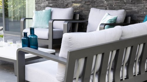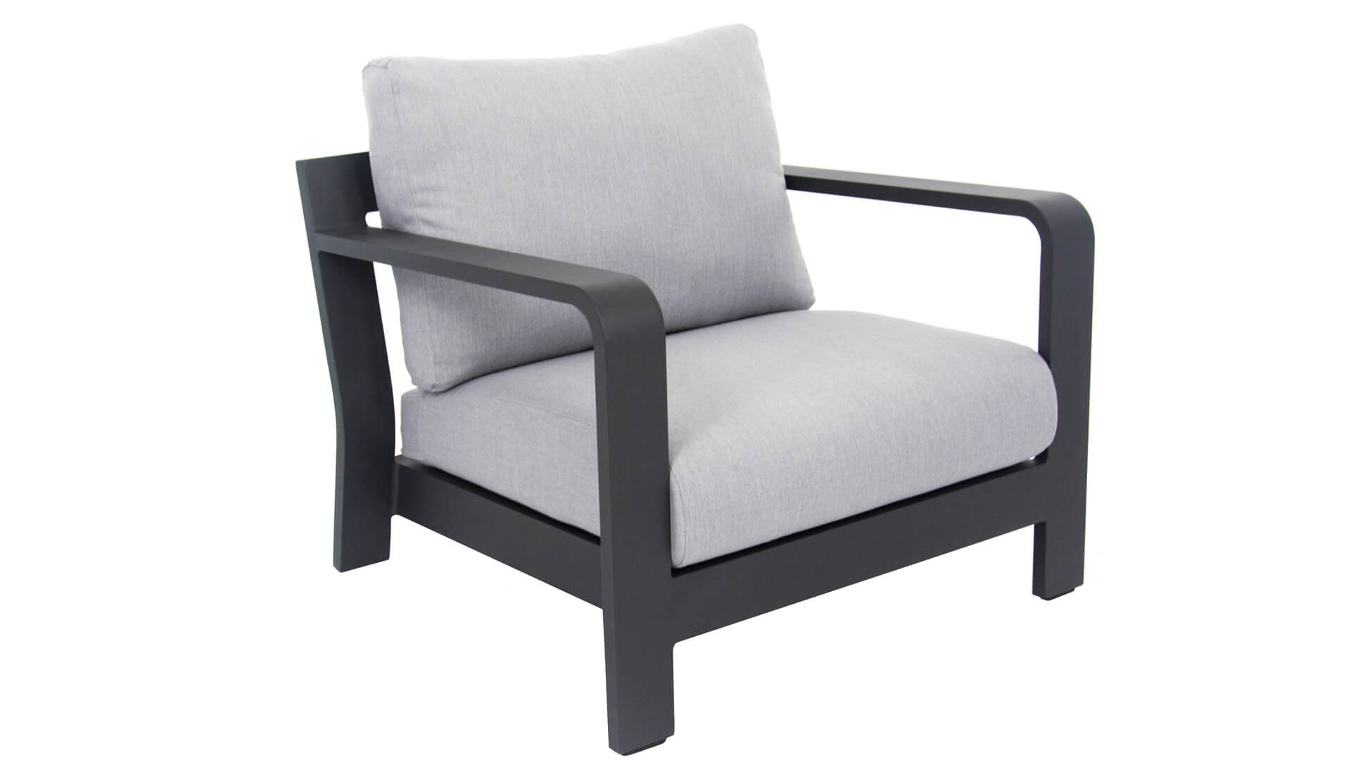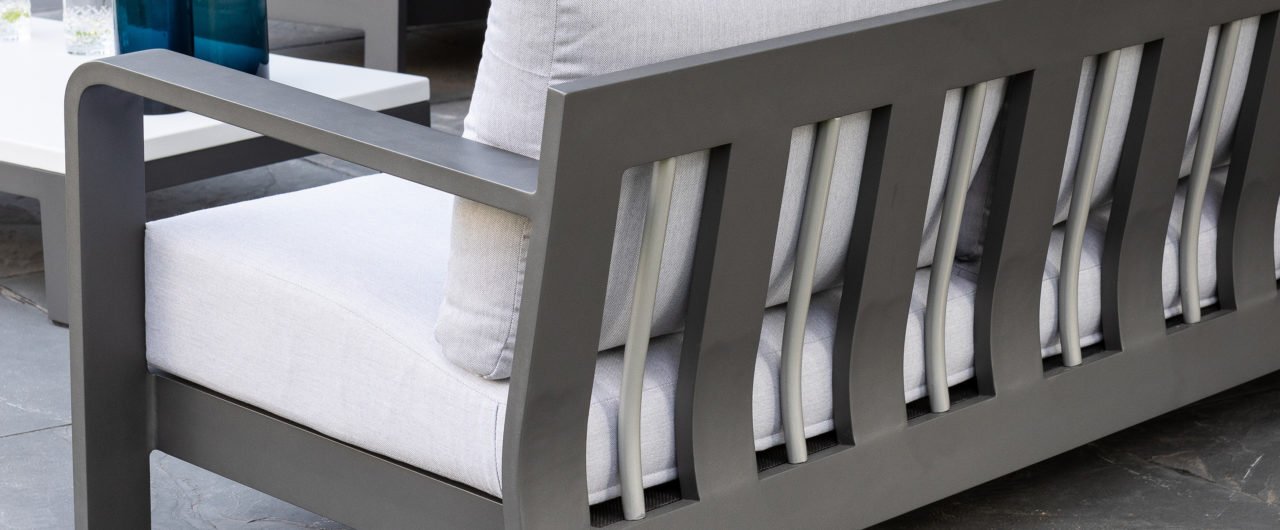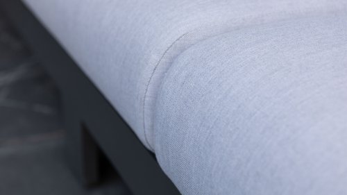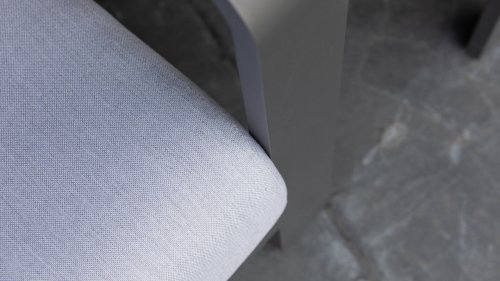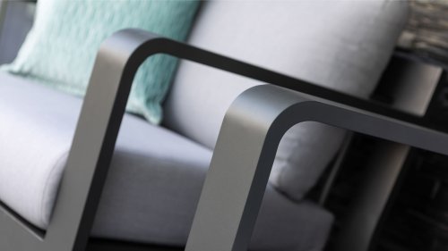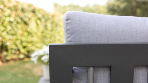 Stoer und kraftvoll, aber dennoch subtil. Der beeindruckende eigene Charakter des Applebee Delgado Loungesets wird durch die gebogenen Linien im Rücken des Loungesessels und des Sofas geprägt. Der Rahmen besteht aus Aluminium und ist in der matten Farbe Anthrazit endverarbeitet. Die Kombination mit den hellgrauen Kissen und den silberfarbenen Aluminiumrohren im Rücken des Möbels verleiht dem Delgado ein luxuriöses Erscheinungsbild.