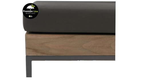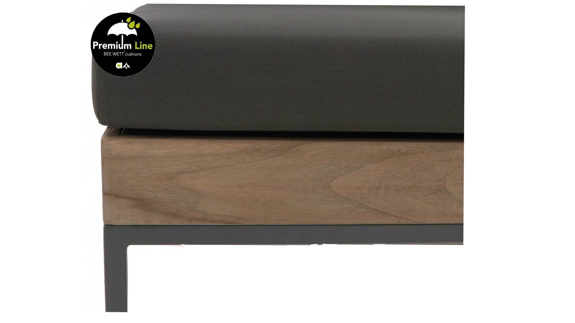 Der schlanke Aluminiumrahmen an der Unterseite des Loungesets sorgt für einen Kontrast zu dem robusten Oberteil. Die dunkelgrauen Bee Wett-Kissen runden das Gesamtbild ab.