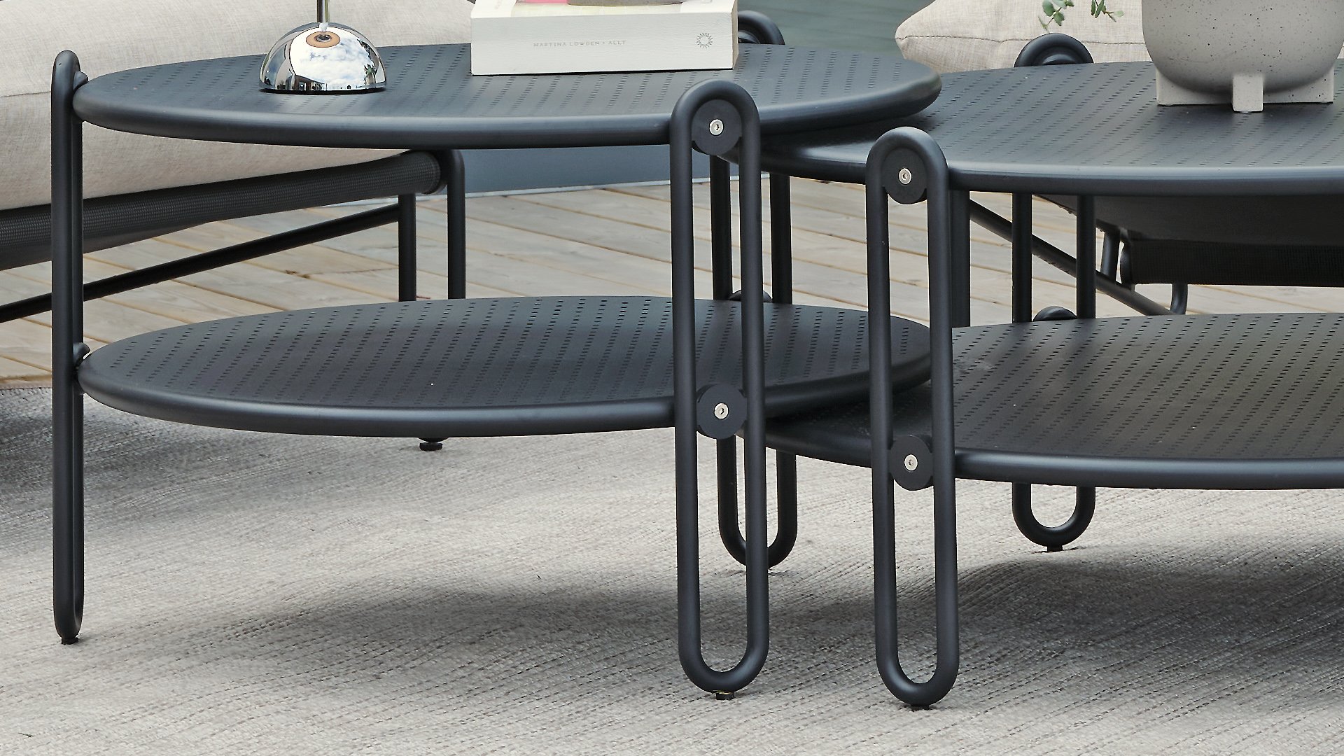 De ronde Blixt salontafel is verkrijgbaar in twee hoogtes en formaten: een hogere (42 cm) met een diameter van 65 cm en een lagere (39 cm) met een diameter van 85 cm. De twee ronde metalen bladen op verschillende niveaus zijn geperforeerd – een mooi en ook praktisch detail. Verkrijgbaar in matzwart en wit. Plaats ze alleen of met twee - ze kunnen elkaar deels overlappen dankzij het kleine hoogteverschil.