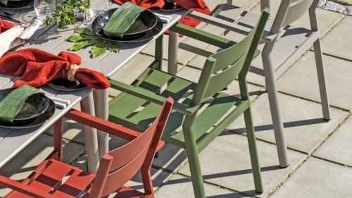 Der Delia Gartenstuhl von BRAFAB ist eine moderne Kollektion bestehend aus stapelbaren Stühlen. Jedes Stück hat eine moderne Ästhetik, mit stilvoll gestalteten Details an Beinen und Rahmen und hervorragendem Sitzkomfort.