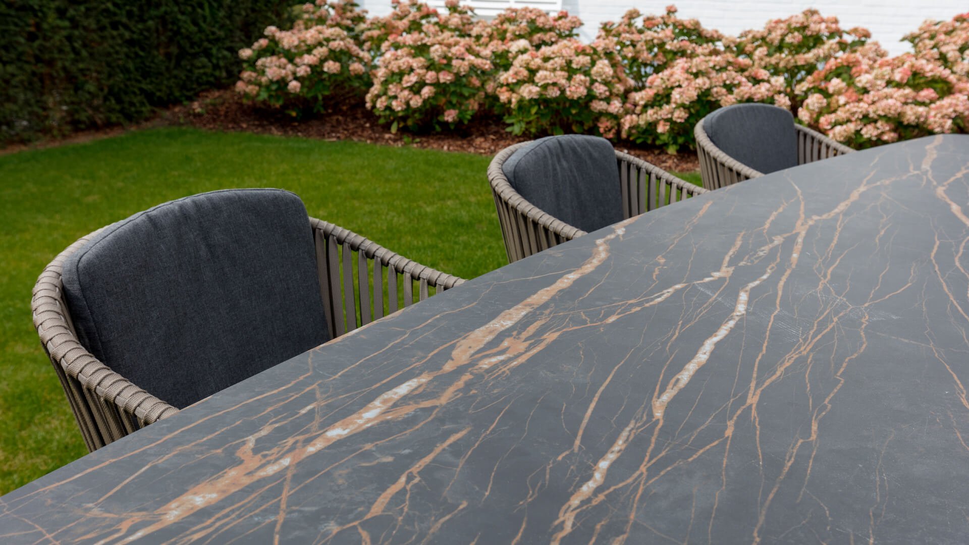 Was für ein stilvoller Tisch! Der Castle Line Sun Tisch besteht aus einem pulverbeschichteten Aluminiumgestell und einer Keramikplatte. Was für ein Hingucker diese Platte!