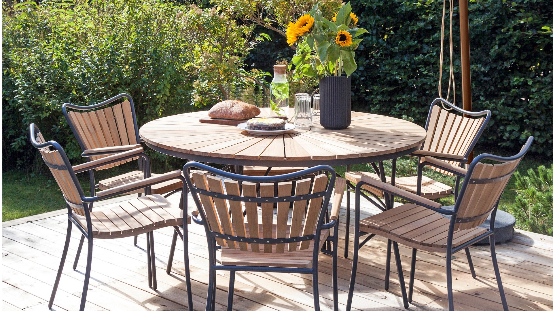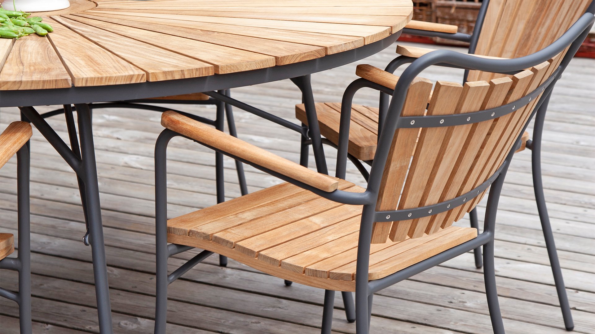 Sowohl die Ellen-Tische als auch die Ellen-Stühle von CINAS sind mit anthrazitfarbenem oder weißem pulverbeschichtetem Aluminiumrahmen erhältlich. Das warme Teakholz in Kombination mit den anthrazitfarbenen oder weißen Rahmen ist eine sehr schöne Kombination.