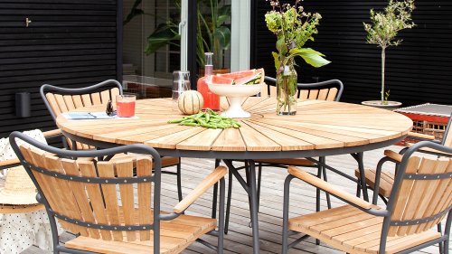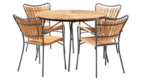 Die schönen CINAS Ellen-Tische haben eine einzigartige Teakholzplatte in Form von Sonnenstrahlen, wenn Ihnen das nicht warm wird!