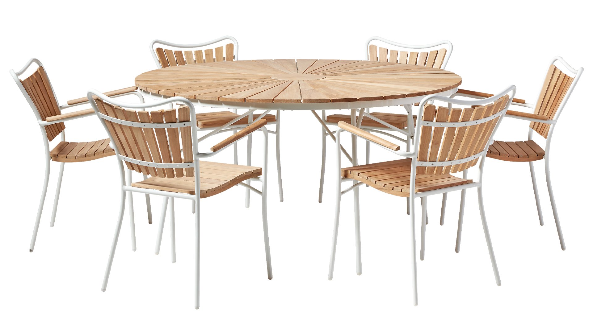 Die schönen CINAS Ellen-Tische haben eine einzigartige Teakholzplatte in Form von Sonnenstrahlen, wenn Ihnen das nicht warm wird!