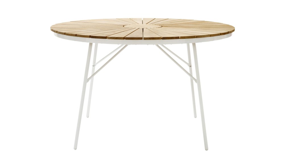 De prachtige CINAS Ellen tafels hebben een uniek teakhouten blad in de vorm van zonnestralen, als je het daar ak niet klekker warm van krijgt! Tafels zijn leverbaar in Ø110cm, Ø130cm, Ø150cm deze tafels zijn nog inklapbaar ook, wat makkelijk en ruimte besprarend opbergen is. Ook is er de Ellen Ø80cm Bistrotafel.