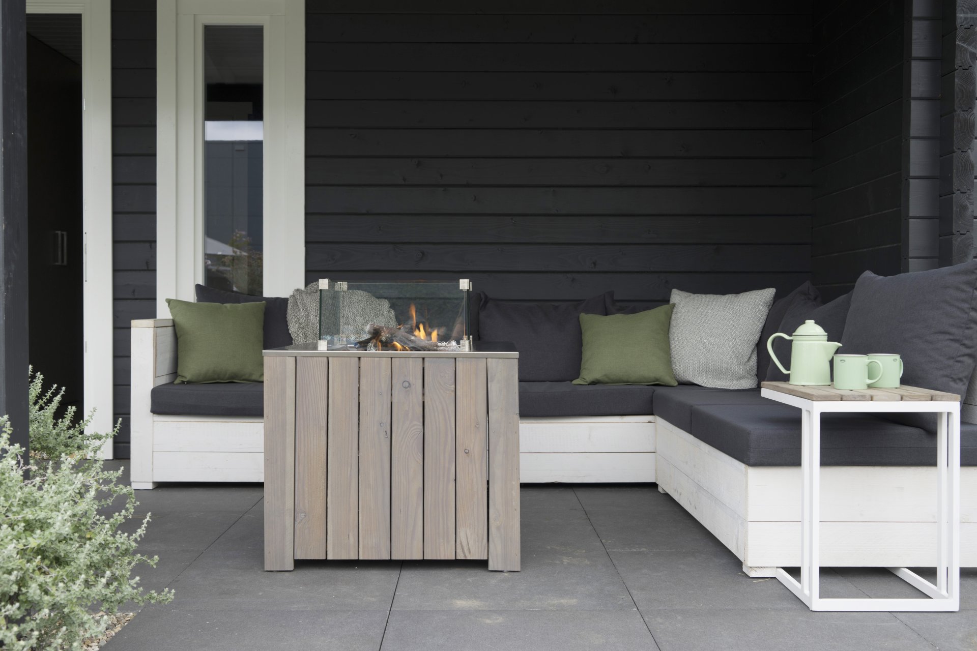 Der Cosicube ist eine wunderbare Ergänzung zu Ihrem Lounge-Set. Der Tisch ist mit einem eingebauten Gaskamin versehen. Aber keine Sorge, Sie werden von Rauch oder Funken nicht belästigt. Der Cosi Cube ist zu hundert Prozent sicher. Der Tisch ist nämlich mit einem Edelstahlbrenner ausgestattet, der durch die mitgelieferten Holzscheite und Lavasteine verdeckt wird. Dadurch ähnelt der Cosi Cube einem mit echtem Holz befeuerten Kamin und sorgt - buchstäblich - für die warme, gemütliche Atmosphäre, die Sie sich wünschen. Und aufgrund der Edelstahltischplatte ist es ein echter Tisch, der ferner aus Douglasienholz mit Grauschleier hergestellt ist. Das Anzünden ist ganz einfach, der Tisch ist mit einer elektronischen Zündung ausgestattet. Der Cosi Cube wird über eine Gasflasche betreiben, die aber auch nicht sichtbar ist. So bleibt der Cosi Cube stilvoll.
