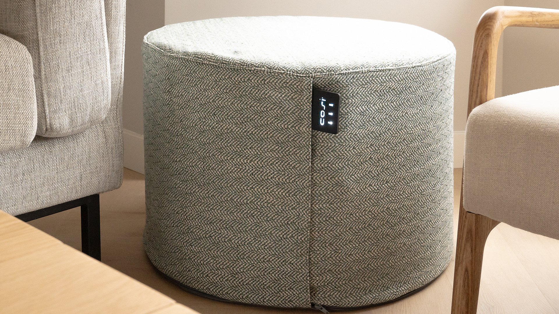 Der umweltfreundliche Cosipouf verfügt über ein einziges Infrarot-Heizelement und wärmt direkt am Körper. Dadurch geht keine Wärme an die (Außen-)Luft verloren. Der Cosipouf verfügt über drei Heizstufen: niedrige 38 °C, mittlere 45 °C und hohe 50 °C, die einfach über den Bedienknopf auf der Ottomane ausgewählt werden können. Bei Verwendung des Ottomanen mit der niedrigsten Heizstufe (+/-38°C) hält der Akku durchschnittlich 5 Stunden. Bei der höchsten Heizstufe (+/-50°C) beträgt die Betriebszeit durchschnittlich 2 Stunden. Sie können den Akku einfach abklemmen und mit dem im Lieferumfang enthaltenen Ladegerät aufladen.