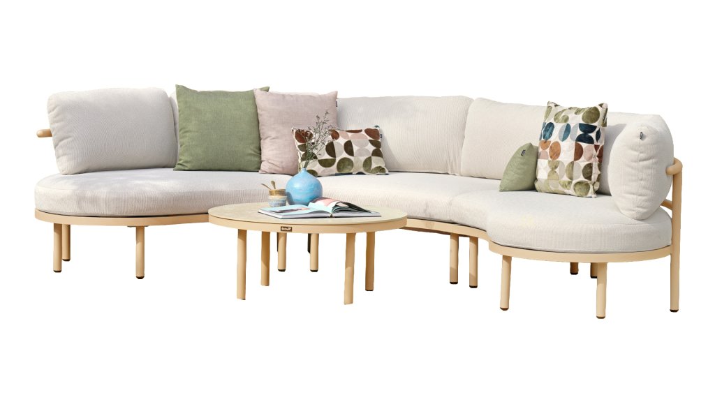 Das Palma runde Loungeset in den Farben Sand, Cappuccino oder Soft Green lädt zum ultimativen Entspannen ein. Der Aluminiumrahmen und die beigen Kissen sind pflegeleicht und wetterbeständig. Die runde Form und der passende Couchtisch sorgen für eine gemütliche, warme Sitzecke.