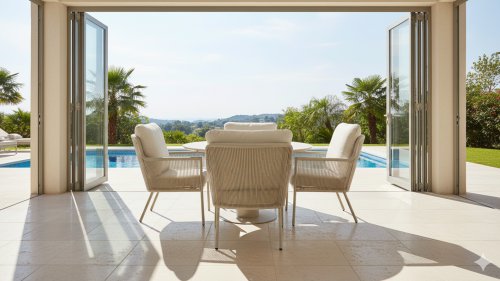 Herrliche Lounge- und Dining Rattanstühle mit weichen beigen Kissen kombiniert mit einem runden Tisch mit keramischer Platte. Perfekt für lange Sommerabende mit Familie oder Freunden.