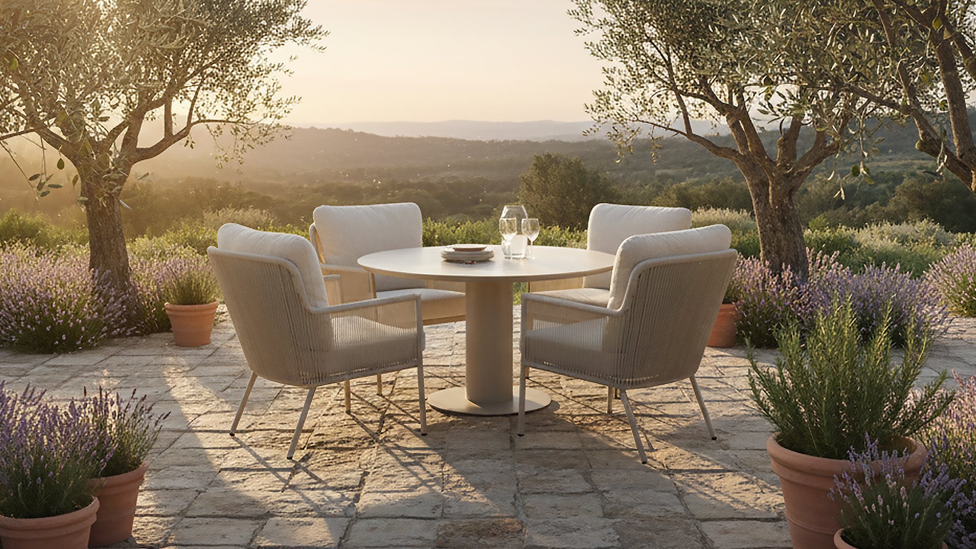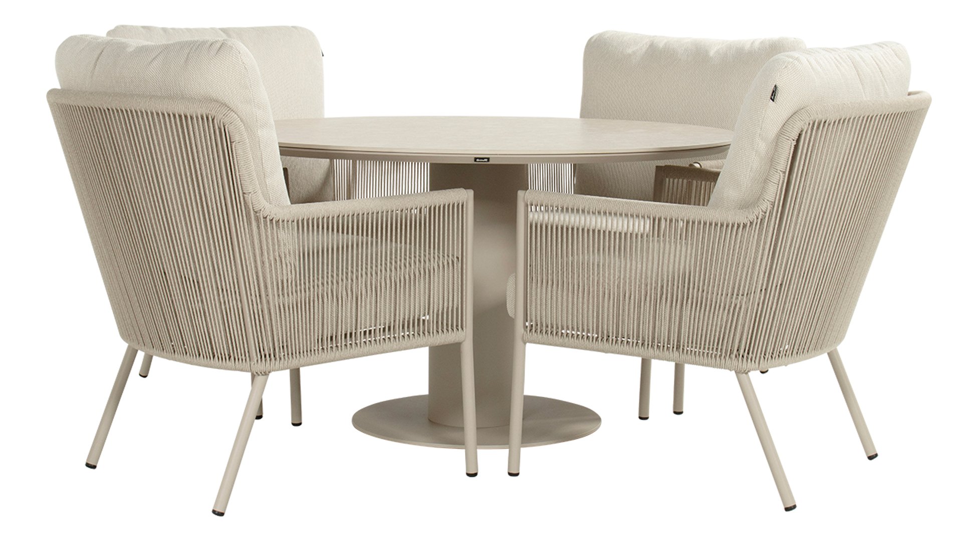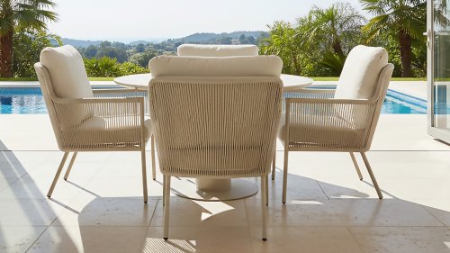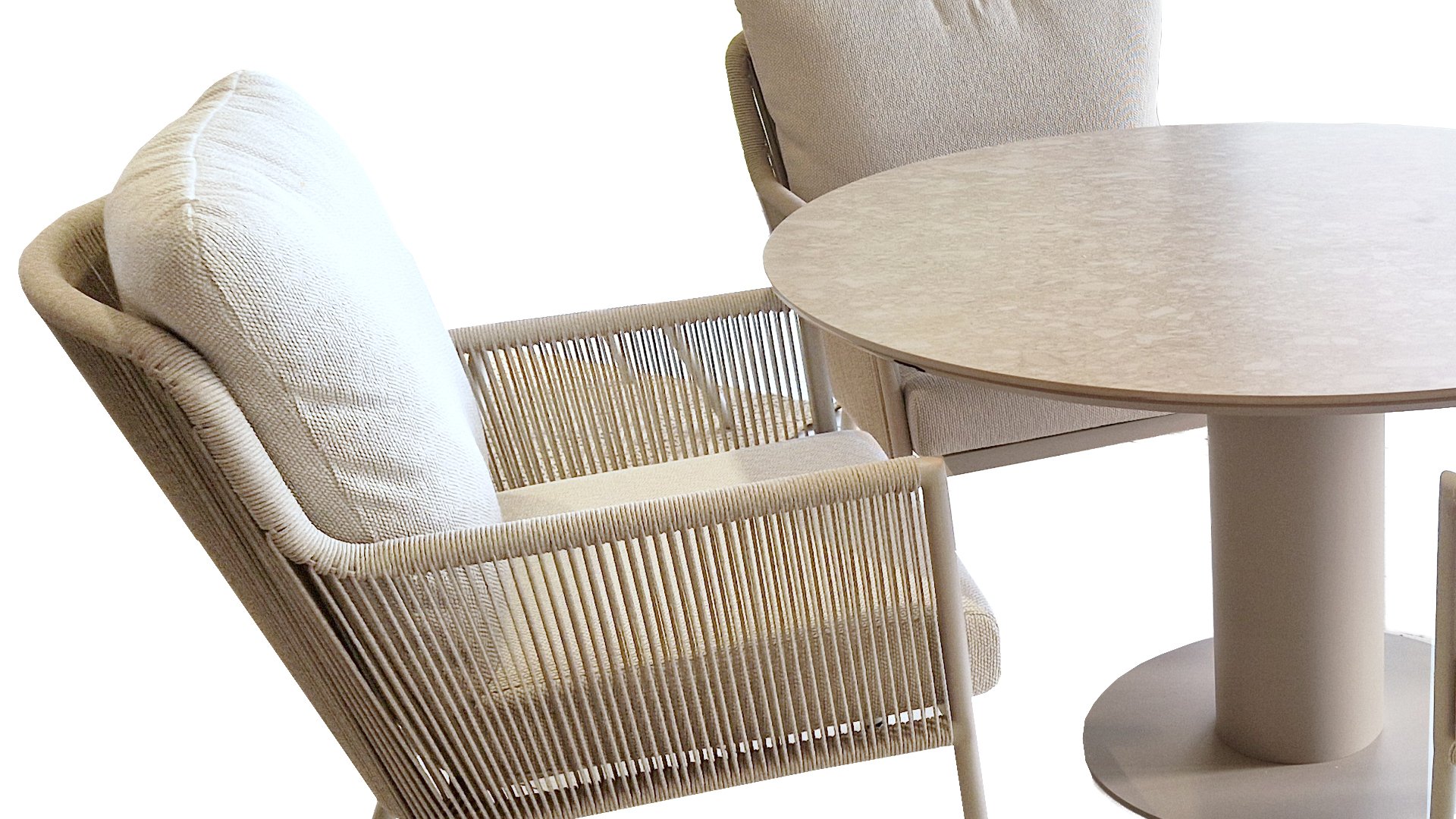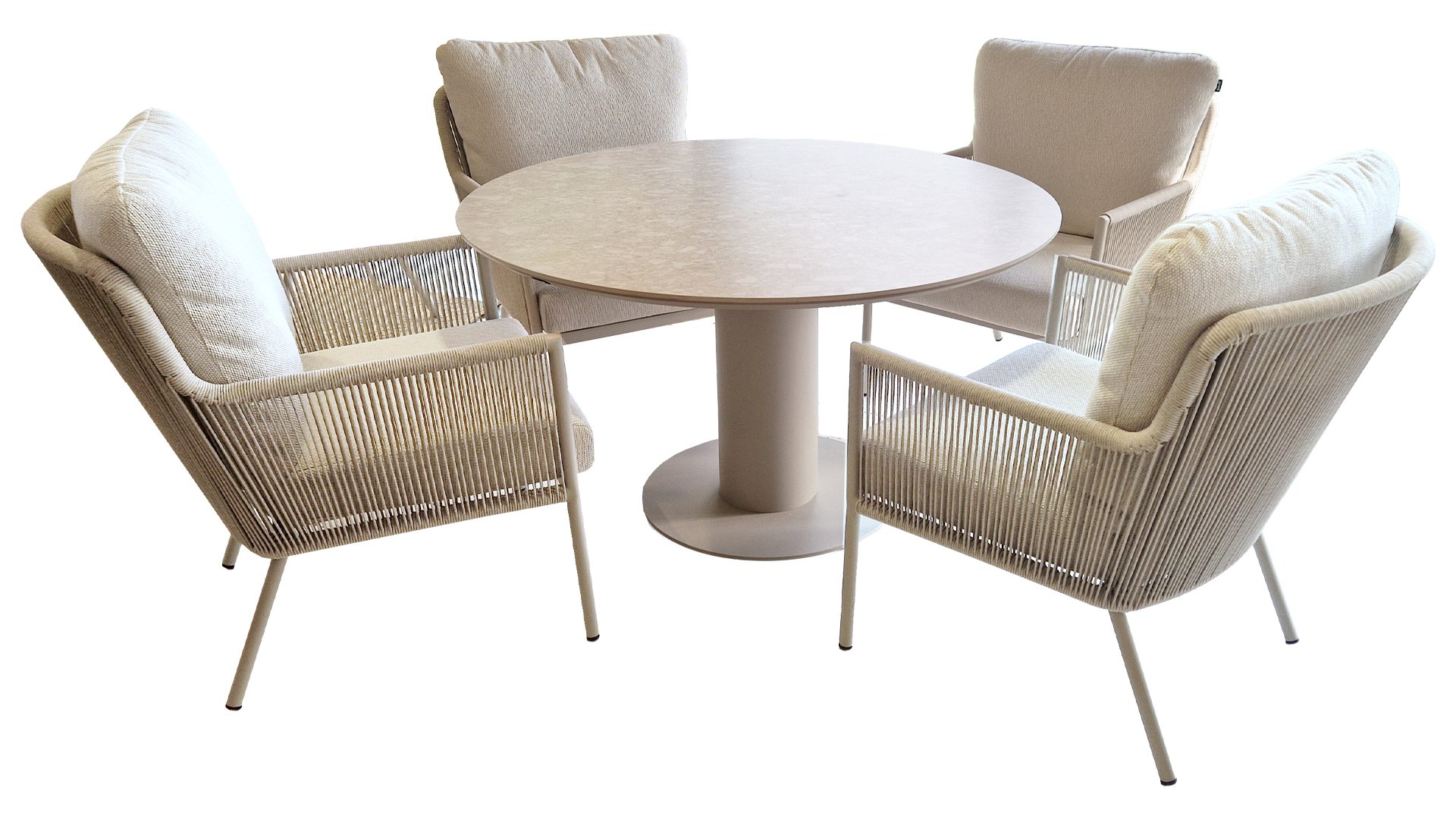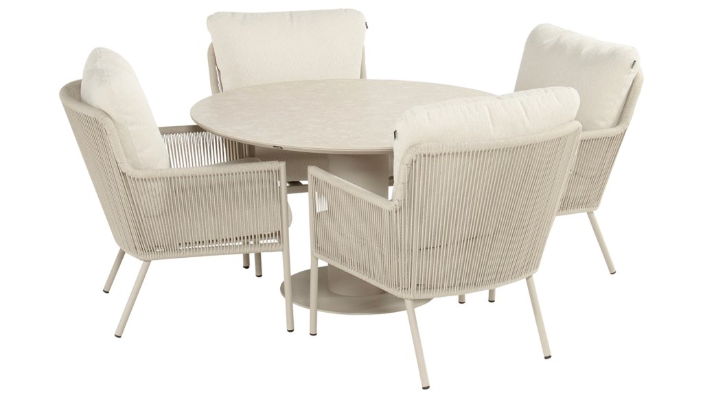 Herrliche Lounge- und Dining Rattanstühle mit weichen beigen Kissen kombiniert mit einem runden Tisch mit keramischer Platte. Perfekt für lange Sommerabende mit Familie oder Freunden.