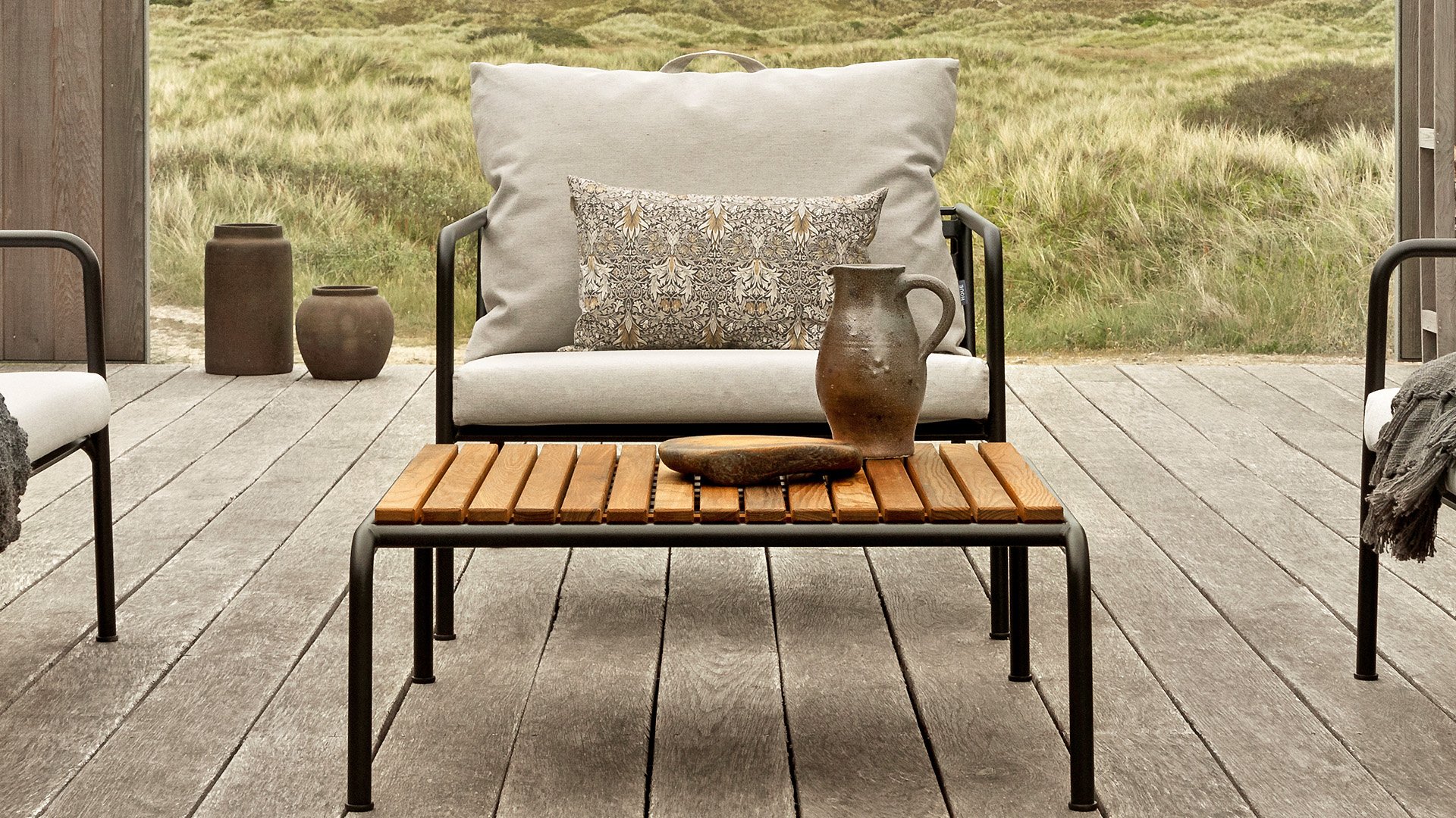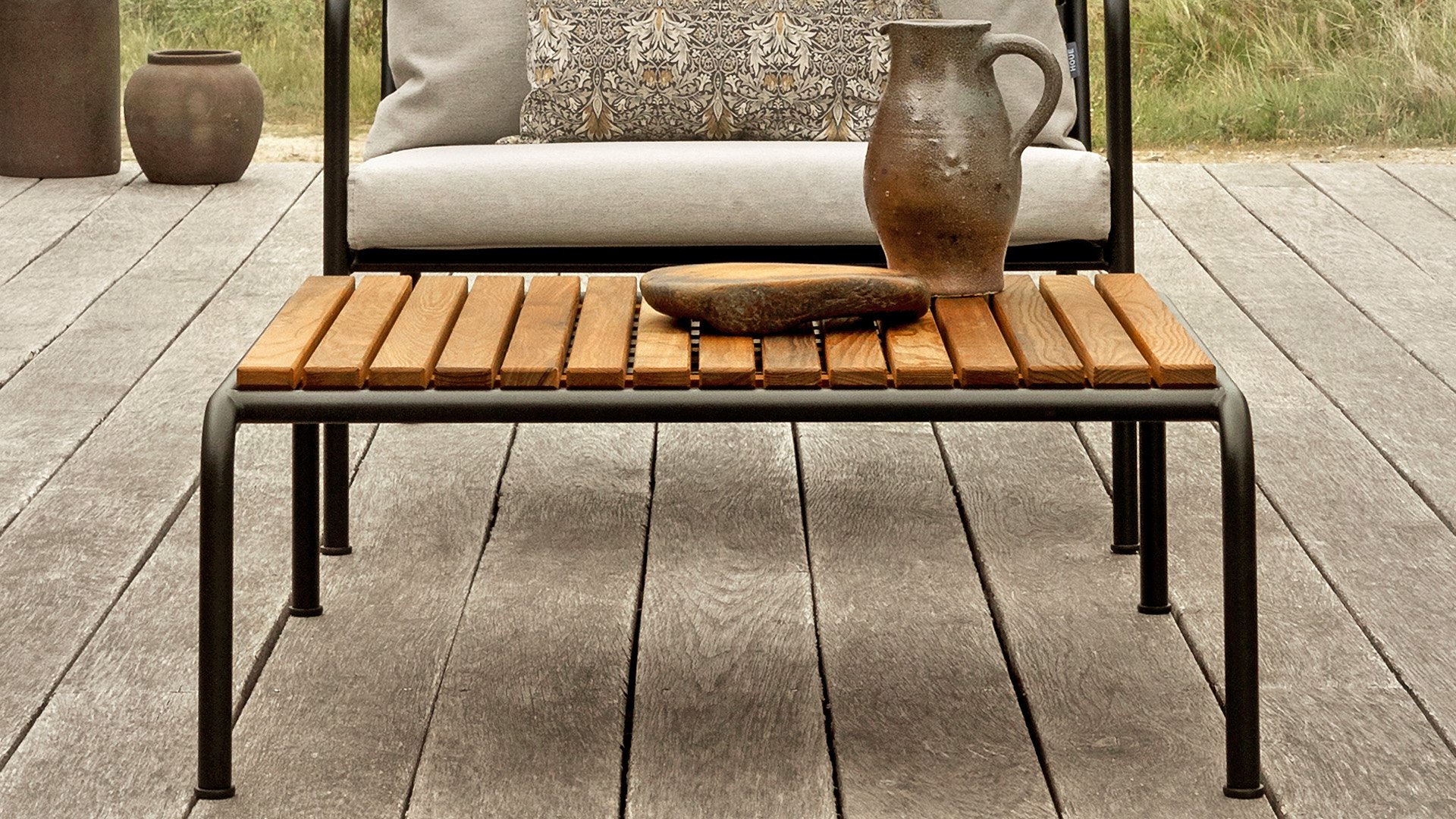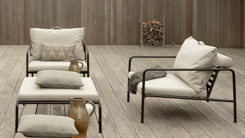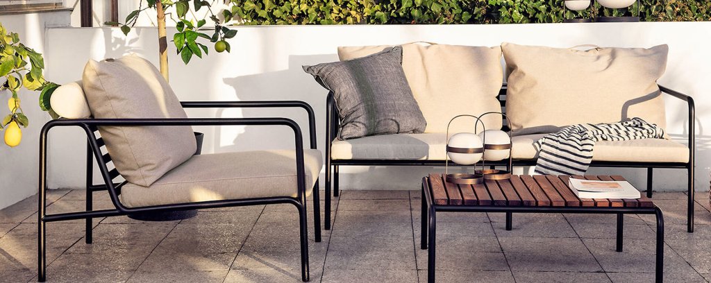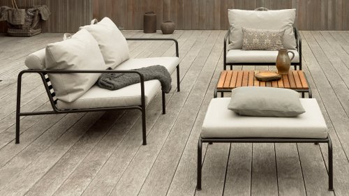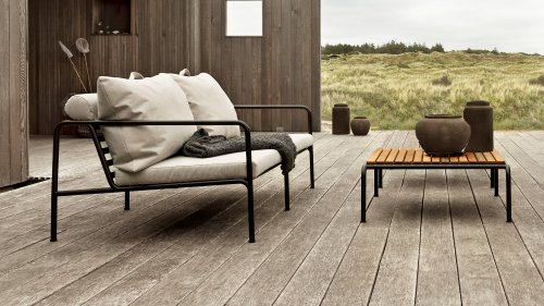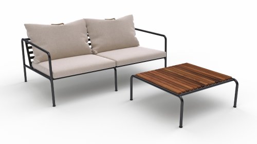Die HOUE AVON Lounge-Kollektion von Houe besteht aus einem 2-Sitzer-Sofa, einem Loungesessel und einer Ottoman mit Kissen aus Sunbrella Heritage-Stoff sowie einem Lounge-Tischrahmen, der mit oder ohne Eschenholz thermisch behandelte-Tischplatte verwendet werden kann. Die Rahmen bestehen aus pulverbeschichtetem schwarzem Stahl. Der zeitlose Charakter von Avon-Möbeln sorgt dafür, dass Sie sie endlos mit anderen Gartenmöbeln kombinieren können.