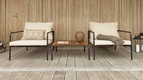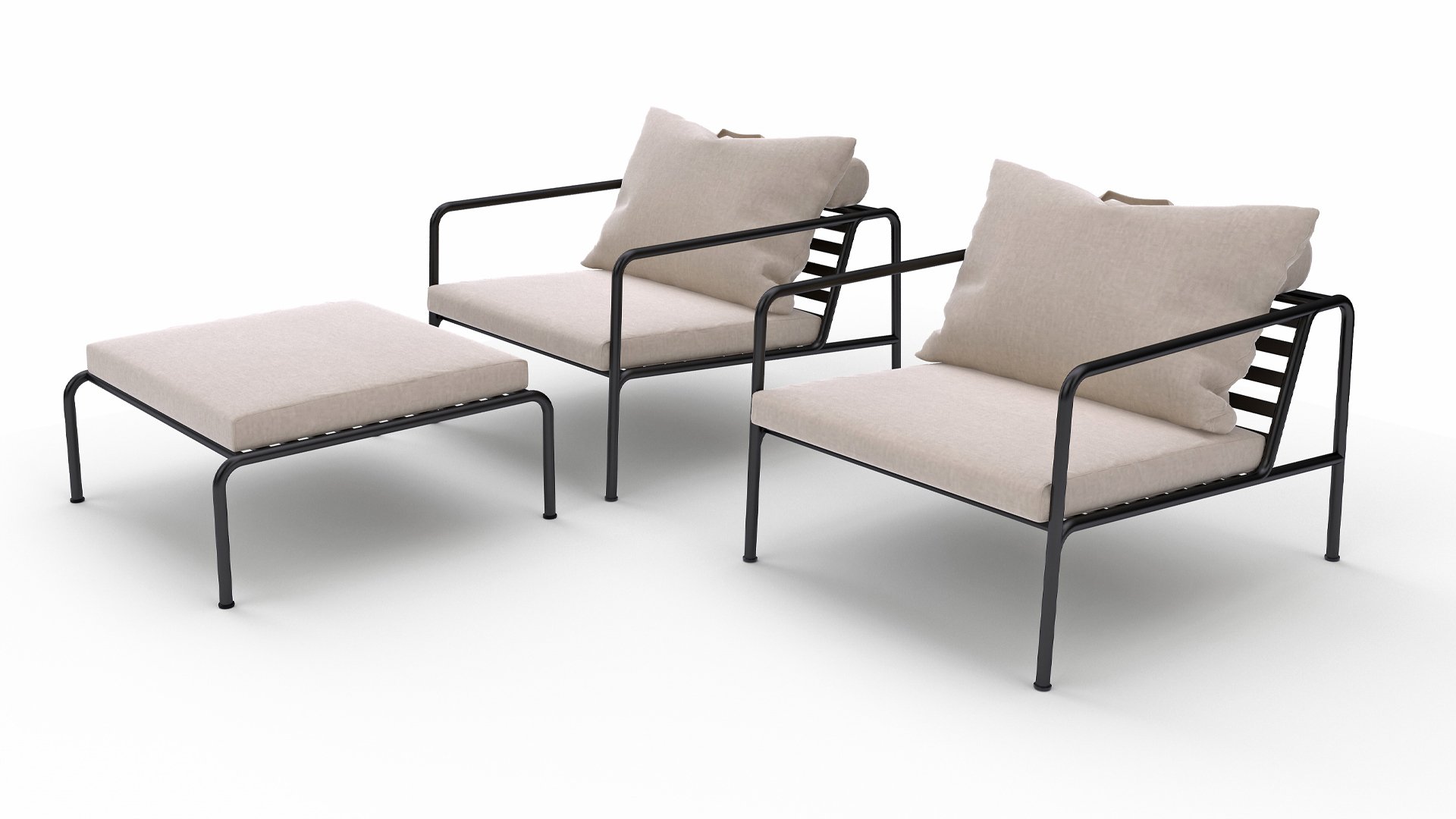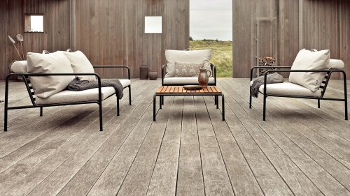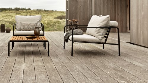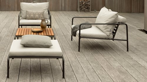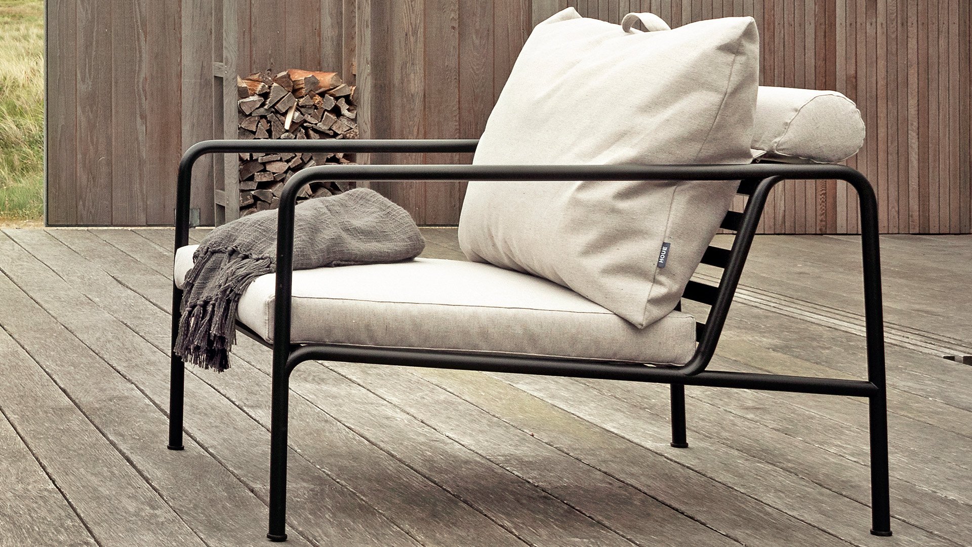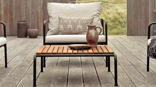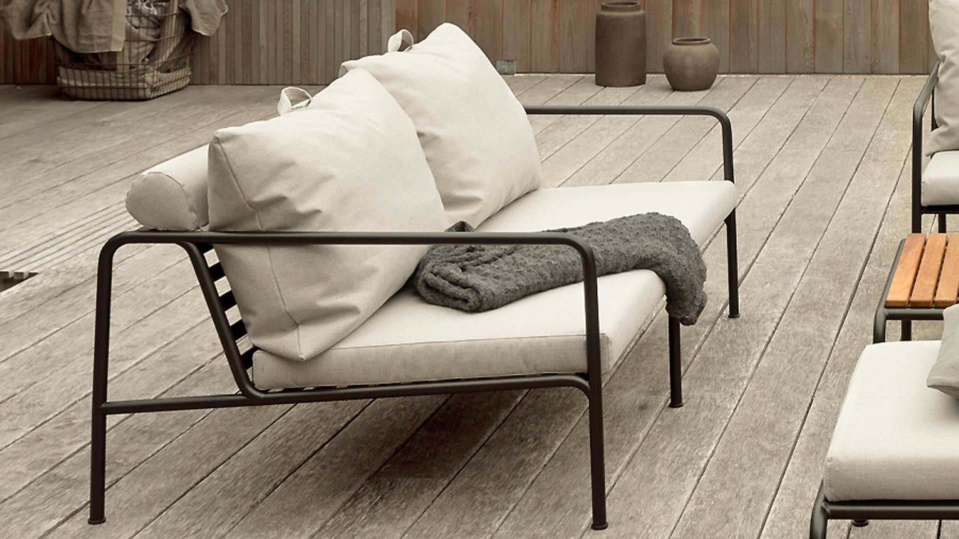Die HOUE AVON Lounge-Kollektion von Houe besteht aus einem 2-Sitzer-Sofa, einem Loungesessel und einer Ottoman mit Kissen aus Sunbrella Heritage-Stoff sowie einem Lounge-Tischrahmen, der mit oder ohne Eschenholz thermisch behandelte-Tischplatte verwendet werden kann. Die Rahmen bestehen aus pulverbeschichtetem schwarzem Stahl. Der zeitlose Charakter von Avon-Möbeln sorgt dafür, dass Sie sie endlos mit anderen Gartenmöbeln kombinieren können.