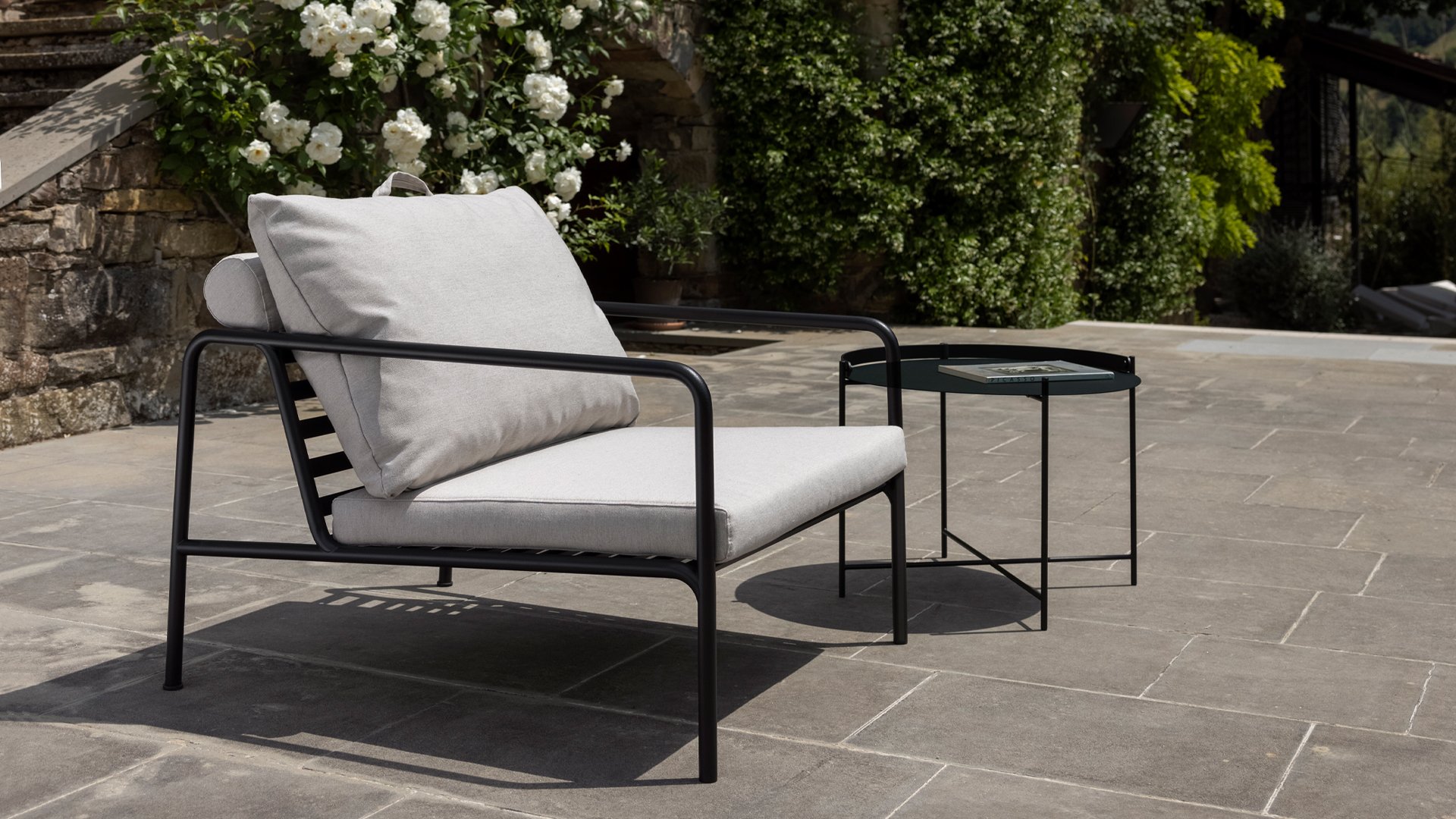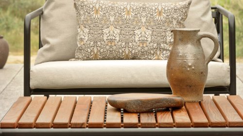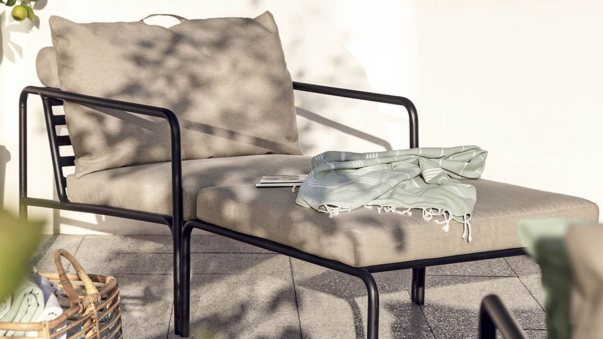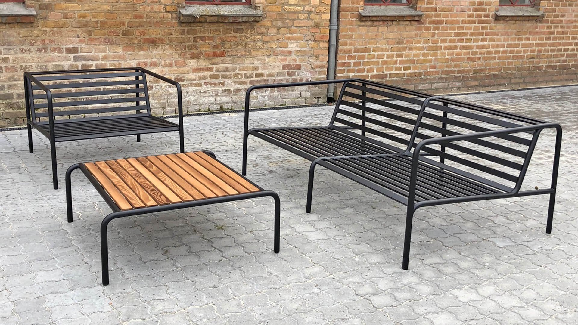 Der wartungsfreie Pulverbeschichteter Rahmen und die Konstruktion der großen weichen Rückenkissen sind genau das - die Einfachheit der Struktur, bei der niedrige Linien dafür sorgen, dass das Design sowohl mit als auch ohne Kissen immer stolz erscheint - Sommer oder Winter. Die Griffe der Kissen sind eine Aussage über die Funktion des Produkts und machen sie bei Bedarf leicht zu greifen und aufzubewahren.