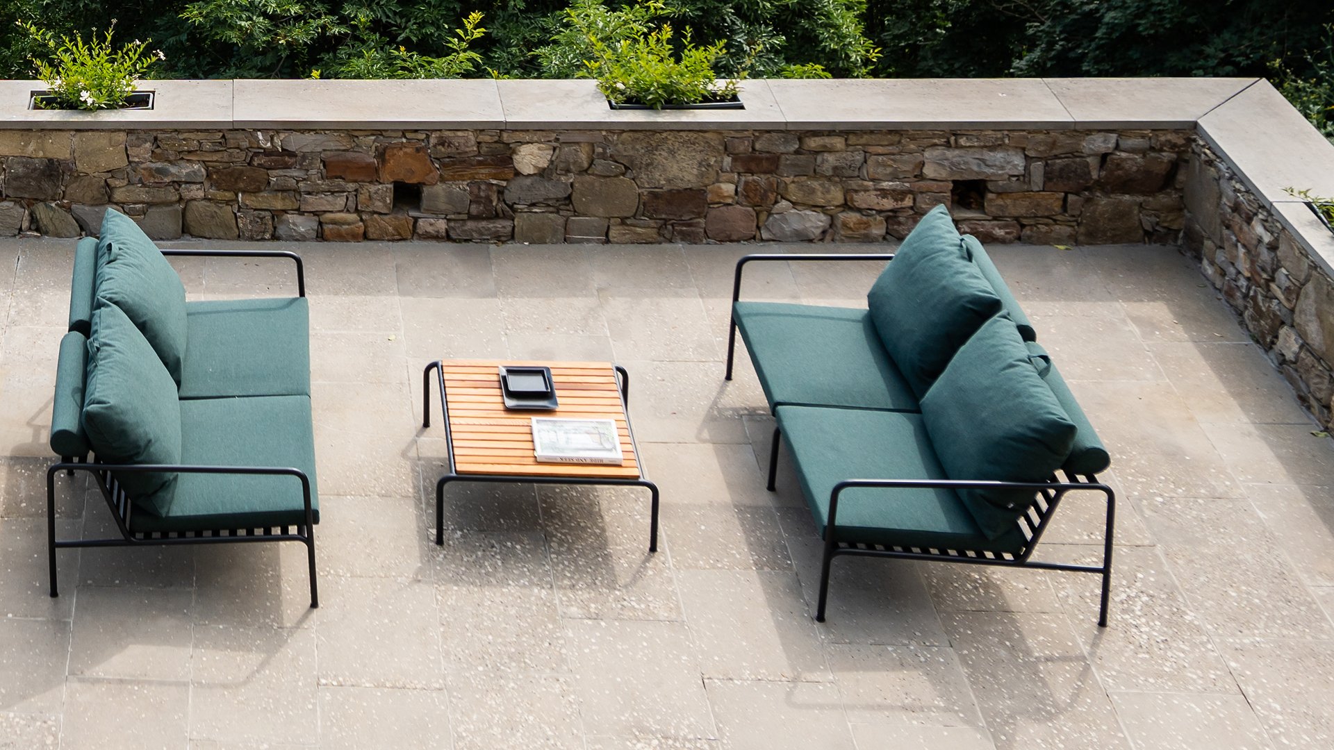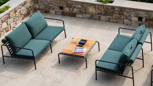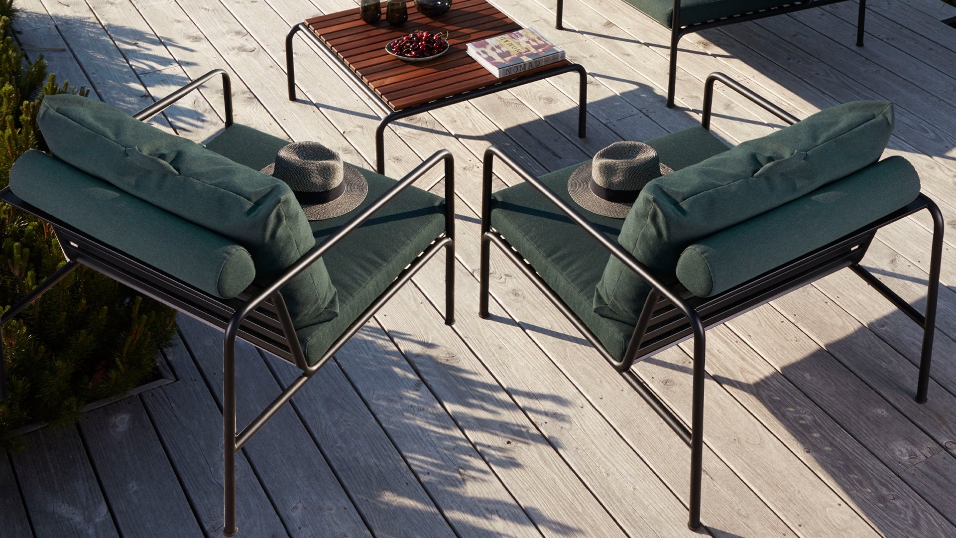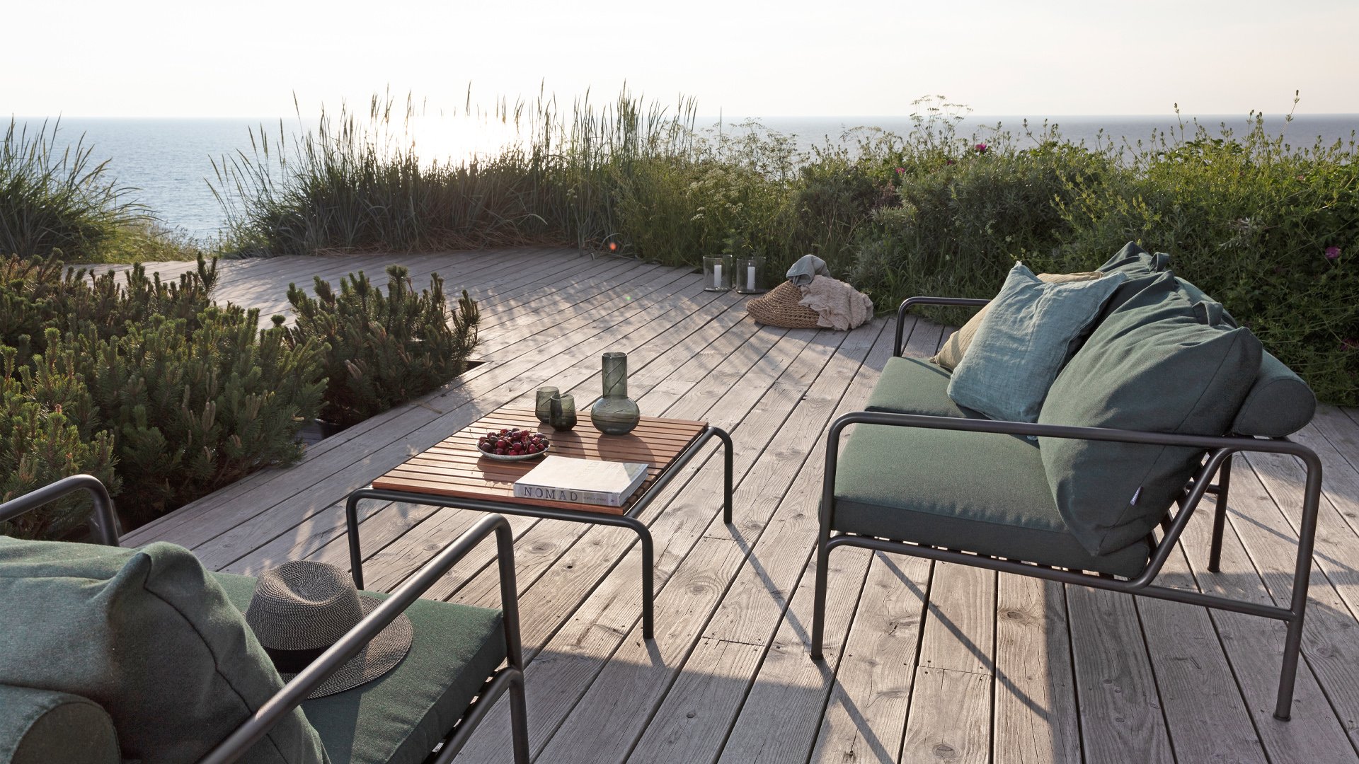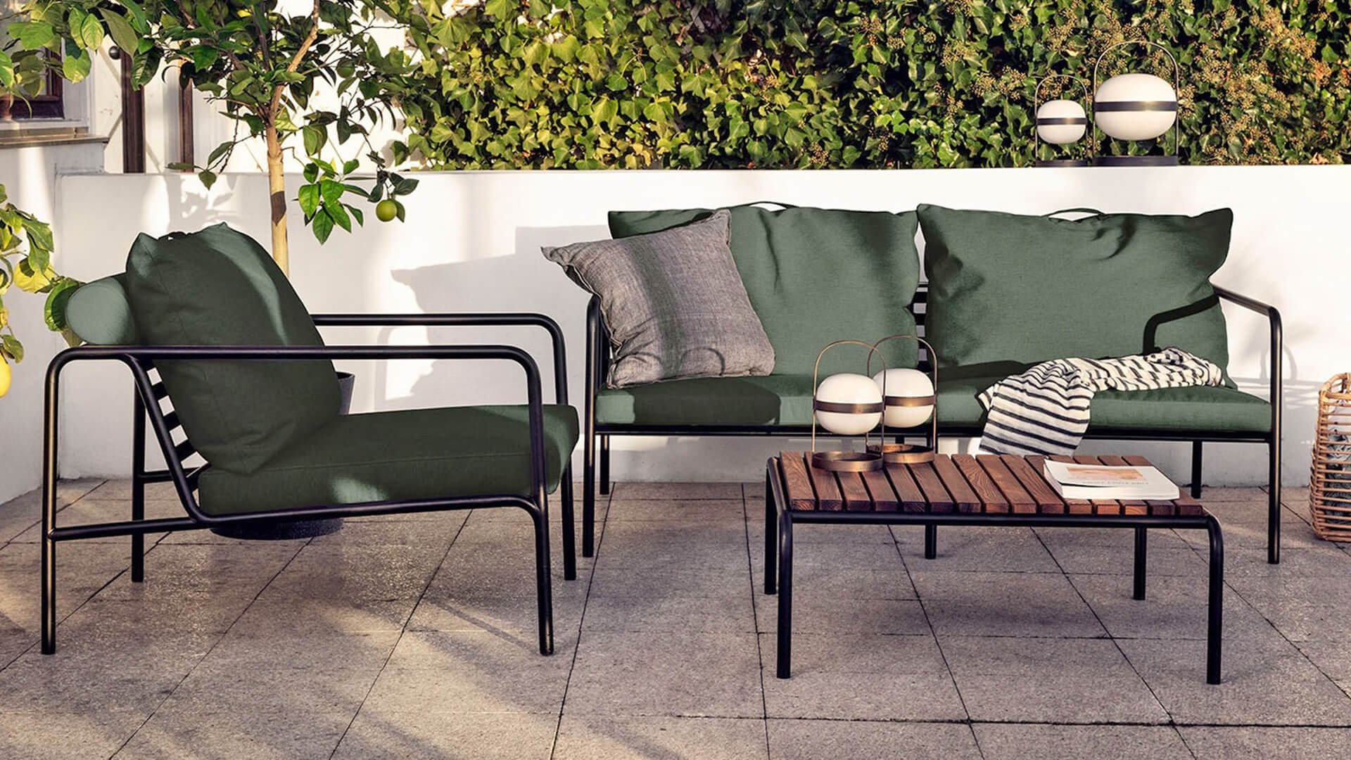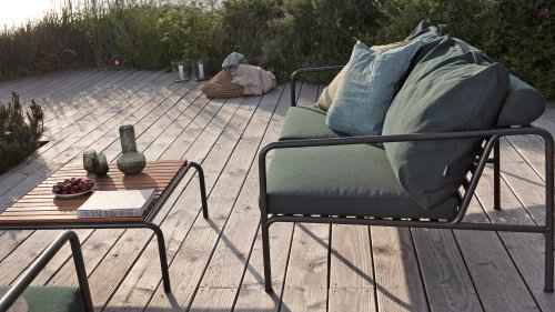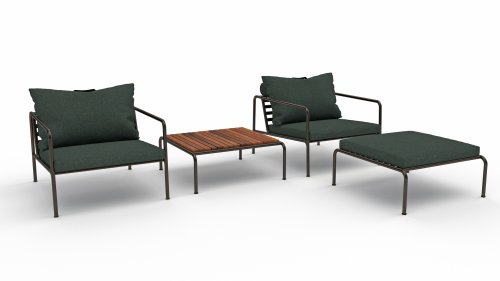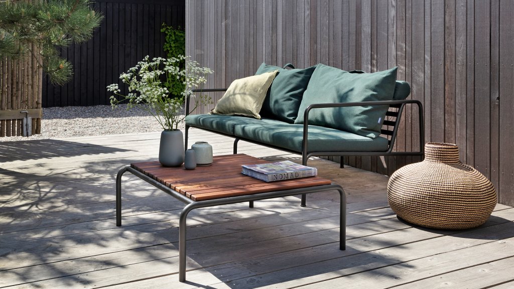 Die HOUE AVON Lounge-Kollektion von Houe besteht aus einem 2-Sitzer-Sofa, einem Loungesessel und einer Ottoman mit Kissen aus Sunbrella Heritage-Stoff sowie einem Lounge-Tischrahmen, der mit oder ohne Eschenholz thermisch behandelte-Tischplatte verwendet werden kann. Die Rahmen bestehen aus pulverbeschichtetem schwarzem Stahl. Der zeitlose Charakter von Avon-Möbeln sorgt dafür, dass Sie sie endlos mit anderen Gartenmöbeln kombinieren können.
