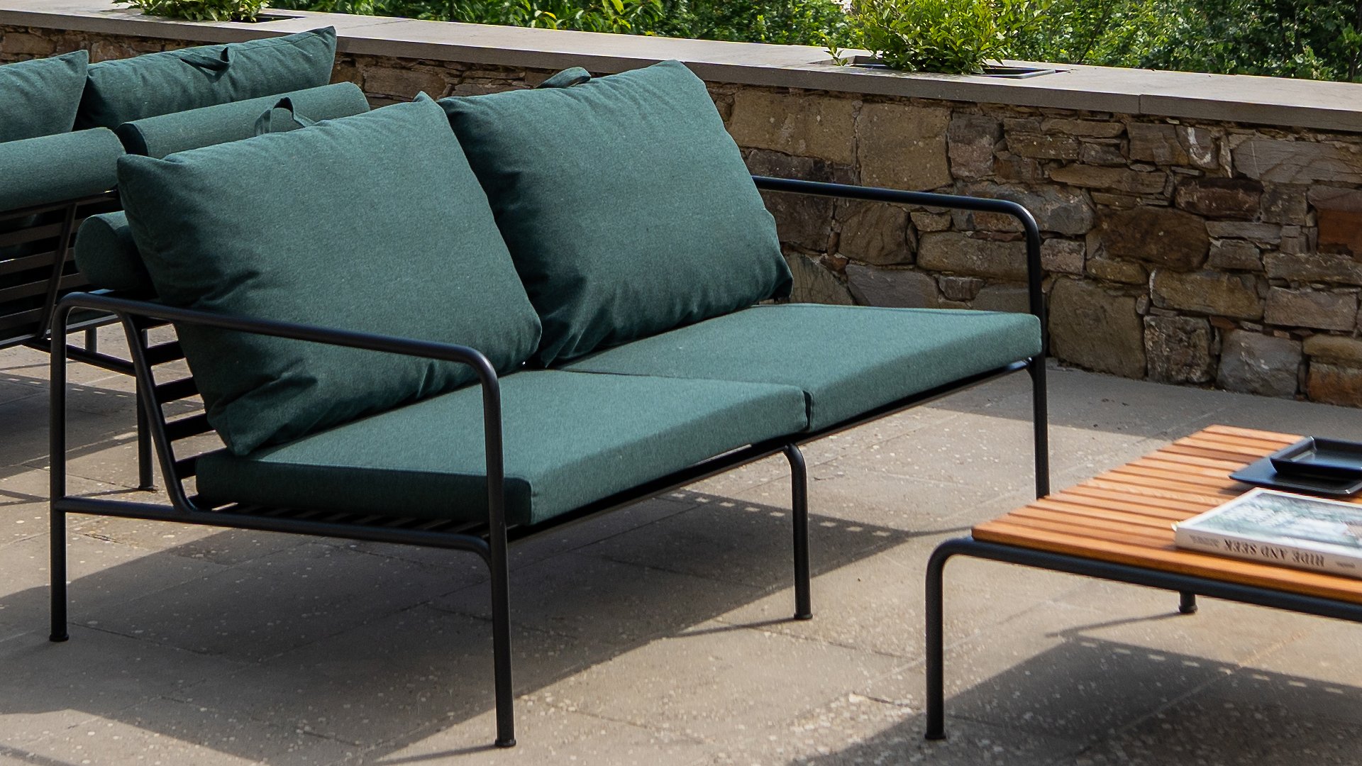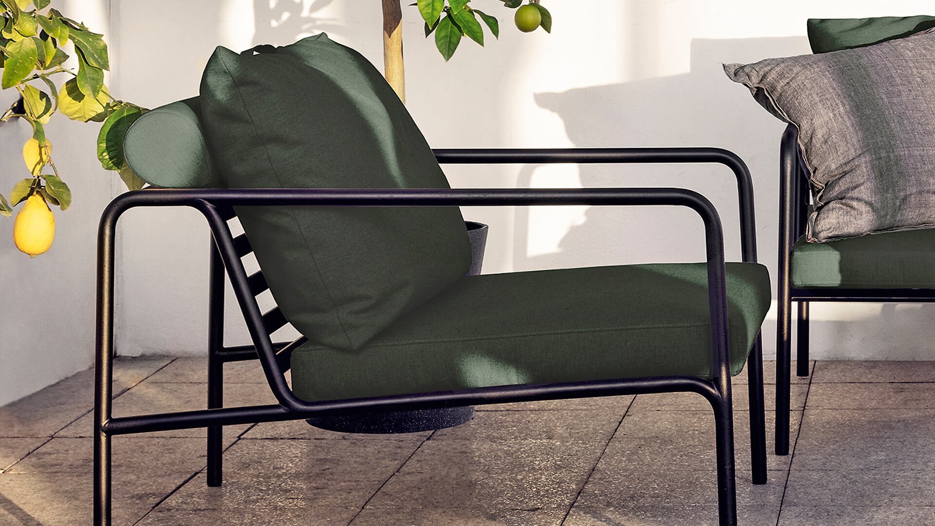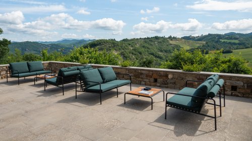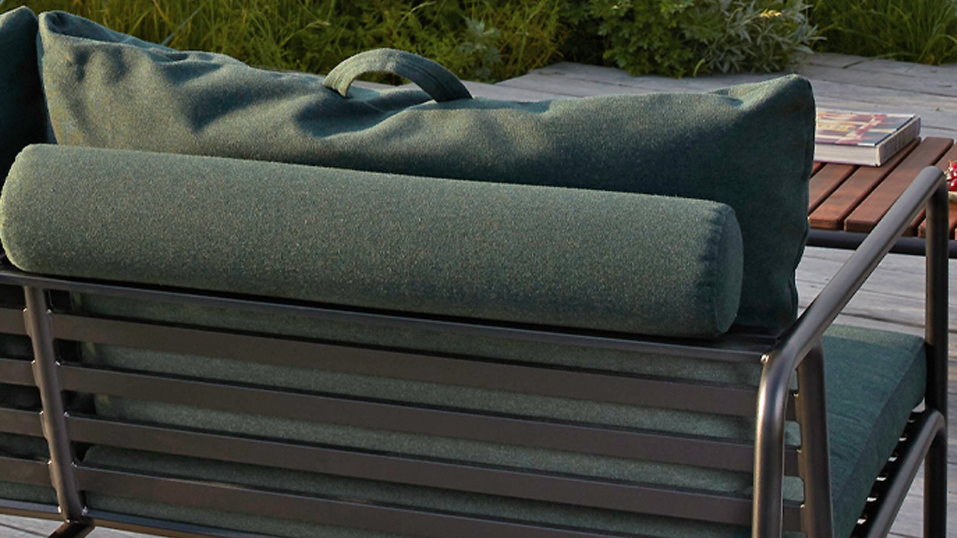 Der wartungsfreie Pulverbeschichteter Rahmen und die Konstruktion der großen weichen Rückenkissen sind genau das - die Einfachheit der Struktur, bei der niedrige Linien dafür sorgen, dass das Design sowohl mit als auch ohne Kissen immer stolz erscheint - Sommer oder Winter. Die Griffe der Kissen sind eine Aussage über die Funktion des Produkts und machen sie bei Bedarf leicht zu greifen und aufzubewahren.