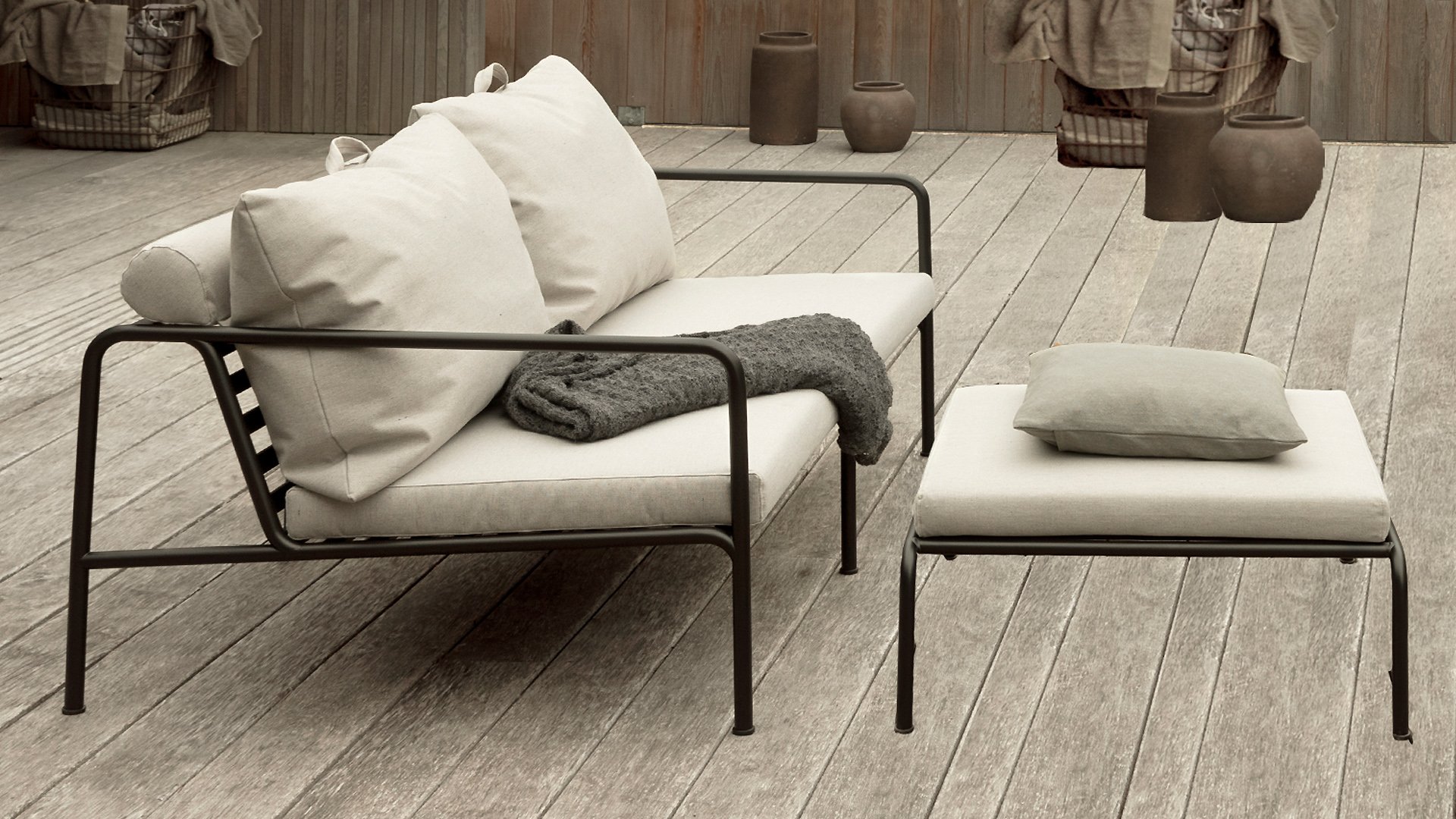 Die HOUE AVON-Kollektion wurde aus dem Wunsch heraus entworfen, etwas mit einem sehr leichten Erscheinungsbild und einem niedrigen, schlanken Profil zu schaffen, während ein hohes Maß an Komfort beibehalten wird. Der wartungsfreie Rahmen und die Konstruktion der großen weichen Rückenkissen ist genau das: die Einfachheit der Struktur, bei der niedrige Linien dafür sorgen, dass das Design immer stolz aussieht, ob mit oder ohne Kissen - Sommer oder Winter. Die Griffe der Kissen sind ein Statement für die Funktion des Produkts und machen sie bei Bedarf leicht zu greifen und zu verstauen.