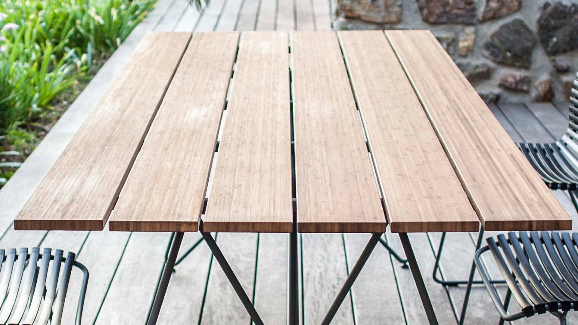 Houe Sketch Gartentisch mit Bambusplatte. Dieser wunderschöne minimalistische Gartentisch der dänischen Designmarke Houe ist in 2 Längen erhältlich: 160 cm und 220 cm. Das Gestell besteht aus Stahl in Kombination mit einer speziellen Pulverbeschichtung, die den Tisch für den Außenbereich geeignet macht. Dieser Tisch passt perfekt zu den Click Dining Gartenstühlen von Houe, das Gestell hat die gleiche Farbe wie das Gestell der Stühle. Da Bambus viel schneller wächst, ist er eine nachhaltige Alternative zu Teak. Bambus sollte 2-3 mal im Jahr geölt werden, dann behält er seine schöne warme Farbe.