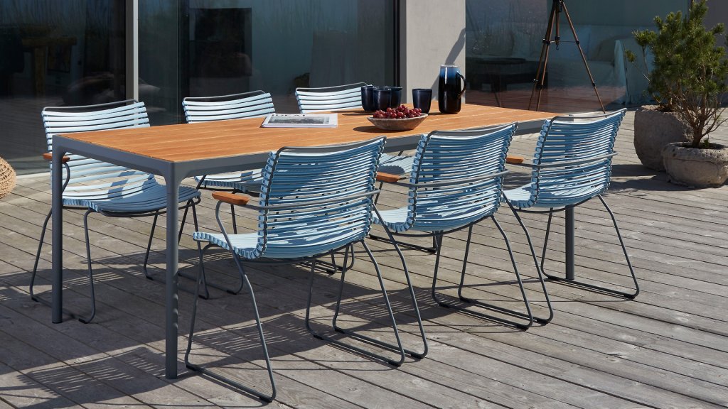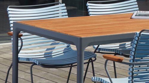 Der Four Tisch von Houe ist ein robustes Modell, das gut in ein industrielles Interieur oder ein cooles Interieur passt. Der Tisch ist so konzipiert, dass er Wind und Wetter standhält. Der Tisch Four hat einen stabilen Aluminiumrahmen, der in grau oder schwarz pulverbeschichtet erhältlich ist. Die Bambus-Tischplatte hat eine Struktur, die sich sehr gut für den Außenbereich eignet. Der Tisch kommt in den Maßen mit einer Länge von 90, 160, 210 und 270 cm und hat alle eine Breite von 90 cm und eine Höhe von 74 cm (Stehtisch 111 cm hoch). Bambus ist eine nachhaltigere Alternative zu Teak. Wir empfehlen, den Bambus 2-3 mal im Jahr zu ölen, dann behält der Tisch länger seine warmen Farben.
