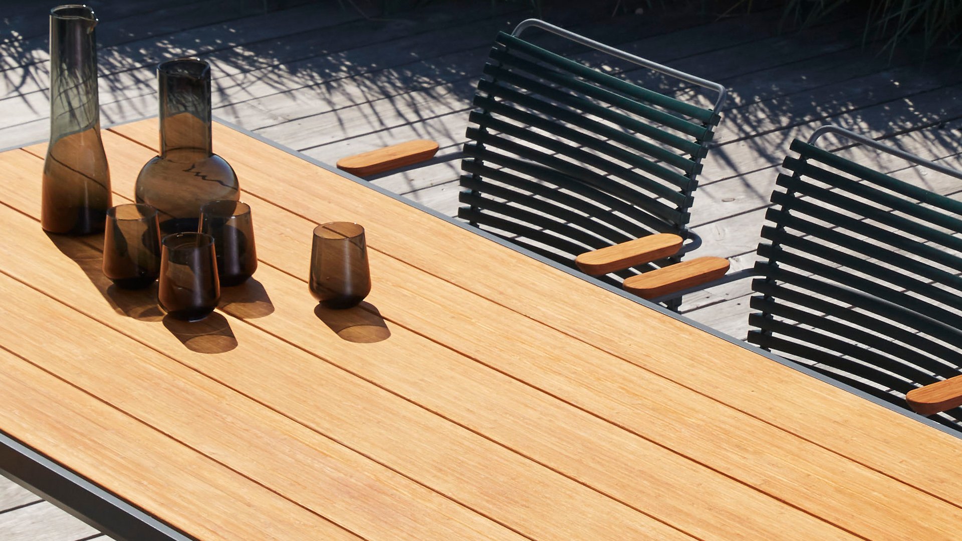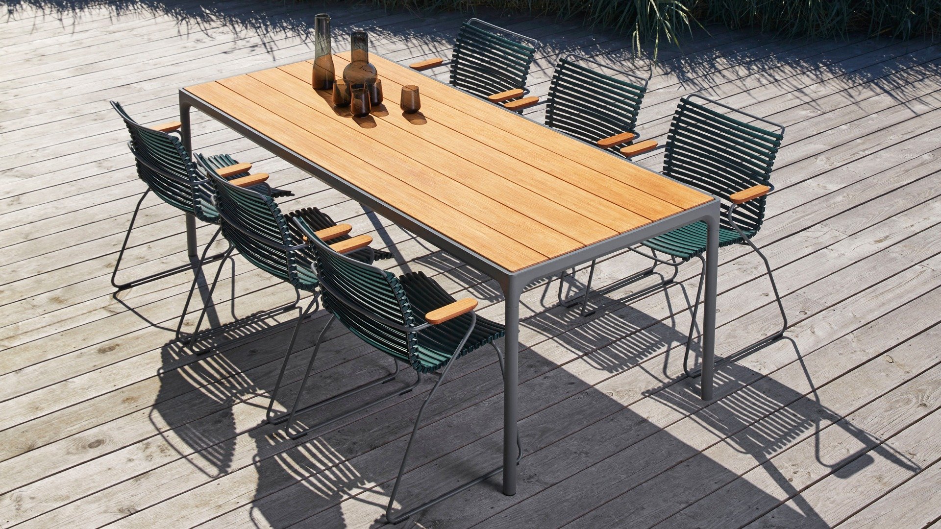 Der Four Tisch von Houe ist ein robustes Modell, das gut in ein industrielles Interieur oder ein cooles Interieur passt. Der Tisch ist so konzipiert, dass er Wind und Wetter standhält. Der Tisch Four hat einen stabilen Aluminiumrahmen, der in grau oder schwarz pulverbeschichtet erhältlich ist. Die Bambus-Tischplatte hat eine Struktur, die sich sehr gut für den Außenbereich eignet. Der Tisch kommt in den Maßen mit einer Länge von 90, 160, 210 und 270 cm und hat alle eine Breite von 90 cm und eine Höhe von 74 cm (Stehtisch 111 cm hoch). Bambus ist eine nachhaltigere Alternative zu Teak. Wir empfehlen, den Bambus 2-3 mal im Jahr zu ölen, dann behält der Tisch länger seine warmen Farben.