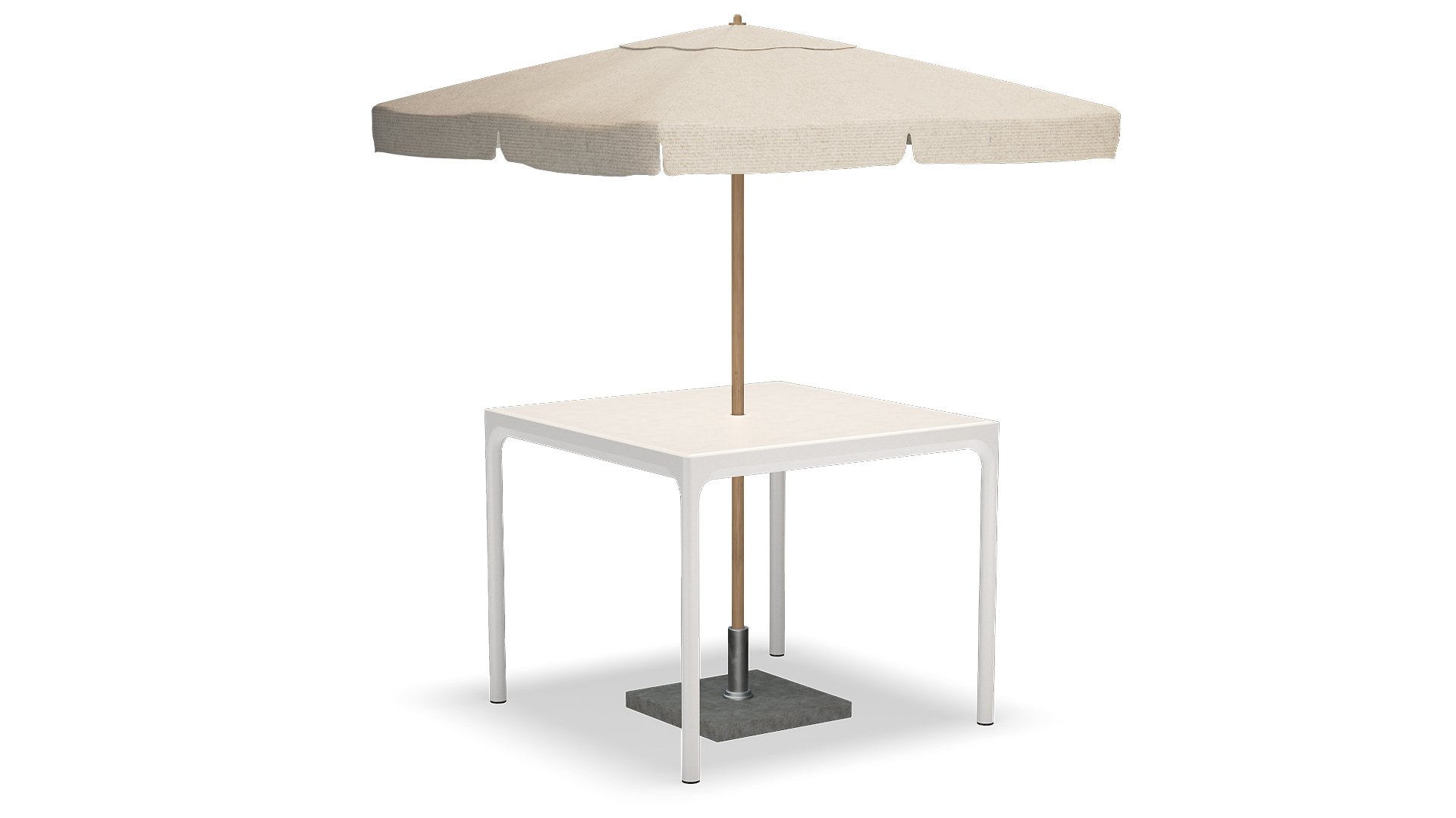 Der Houe Four Tisch ist ein robustes Modell, das sich ideal für industrielle oder rustikale Interieurs eignet. Er ist wetterfest und verfügt über ein stabiles Aluminiumgestell, das in den pulverbeschichteten Farben Black, Olive Green oder Muted White erhältlich ist. Der 90 x 90 cm große Tisch ist mit einer Öffnung für einen Sonnenschirm ausgestattet.