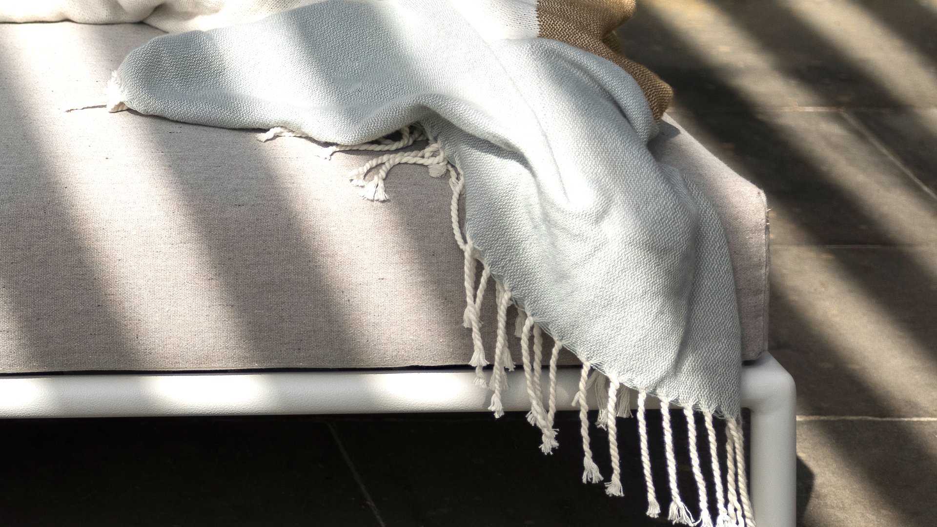 Wasser fließt direkt durch den speziellen Schaum hindurch, während ein weiteres Material, Dacron, dafür sorgt, dass die Kissen ihre originale Form behalten. Die Polster sind ausziehbar und waschbar. Die Kissen in der Lounge sind mit einem speziellen Outdoor-Stoff mit einer Basis aus Quickdry-Schaum versehen. Dadurch sind die Kissen in kürzester Zeit wieder trocken und es bildet sich kein Schimmel. Die Stoffe sind leicht mit einem milden Reinigungsmittel zu reinigen. Die Kissen sind abnehmbar und bei 30 Grad waschbar.Die Kissen in Alpengrün und Esche in Hellgrau / Ecru-Farbe die Char Farbe bestehen aus Sunbrella Heritage-Material, das zu 50% aus recyceltem Acryl besteht. Bunte Faserenden aus dem Recycling des Primärmaterials können im Stoff auftreten und die Stofffarbe von Charge zu Charge variieren. Dadurch entsteht ein einzigartiger Stoff mit natürlichem Aussehen und Vintage-Charme. Der Stoff ist Oeko-tex-zertifiziert, wasserabweisend, schmutzabweisend und wartungsfreundlich.