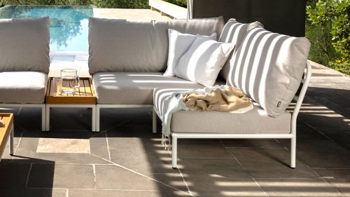 Die Level-2 Lounge besteht aus verschiedenen Elementen, die viele Kombinationen ermöglichen. Der Lounge-Rahmen besteht aus Aluminium und ist hervorragend pulverbeschichtet. Die Kissen in der Lounge sind mit einem speziellen Outdoor-Stoff mit einer Basis aus Quickdry-Schaum versehen. Dadurch sind die Kissen in kürzester Zeit wieder trocken und es bildet sich kein Schimmel. Die Stoffe sind leicht mit einem milden Reinigungsmittel zu reinigen. Die Kissen sind abnehmbar und bei 30 Grad waschbar. Die Kissen sind aus Sunbrella Heritage-Material, das zu 50% aus recyceltem Acryl besteht. Bunte Faserenden aus dem Recycling des Primärmaterials können im Stoff auftreten und die Stofffarbe von Charge zu Charge variieren. Dadurch entsteht ein einzigartiger Stoff mit natürlichem Aussehen und Vintage-Charme. Der Stoff ist Oeko-tex-zertifiziert, wasserabweisend, schmutzabweisend und wartungsfreundlich.