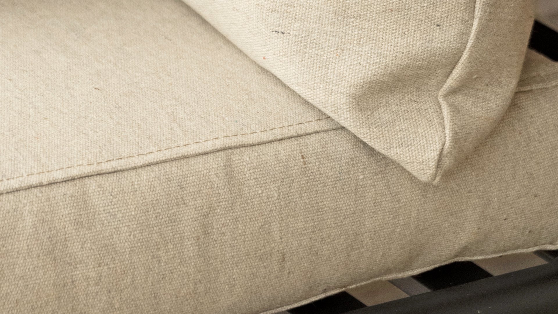 Wasser fließt direkt durch den speziellen Schaum hindurch, während ein weiteres Material, Dacron, dafür sorgt, dass die Kissen ihre originale Form behalten. Die Polster sind ausziehbar und waschbar. Die Kissen in der Lounge sind mit einem speziellen Outdoor-Stoff mit einer Basis aus Quickdry-Schaum versehen. Dadurch sind die Kissen in kürzester Zeit wieder trocken und es bildet sich kein Schimmel. Die Stoffe sind leicht mit einem milden Reinigungsmittel zu reinigen. Die Kissen sind abnehmbar und bei 30 Grad waschbar.Die Kissen in Alpengrün und Esche in Hellgrau / Ecru-Farbe bestehen aus Sunbrella Heritage-Material, das zu 50% aus recyceltem Acryl besteht. Bunte Faserenden aus dem Recycling des Primärmaterials können im Stoff auftreten und die Stofffarbe von Charge zu Charge variieren. Dadurch entsteht ein einzigartiger Stoff mit natürlichem Aussehen und Vintage-Charme. Der Stoff ist Oeko-tex-zertifiziert, wasserabweisend, schmutzabweisend und wartungsfreundlich.