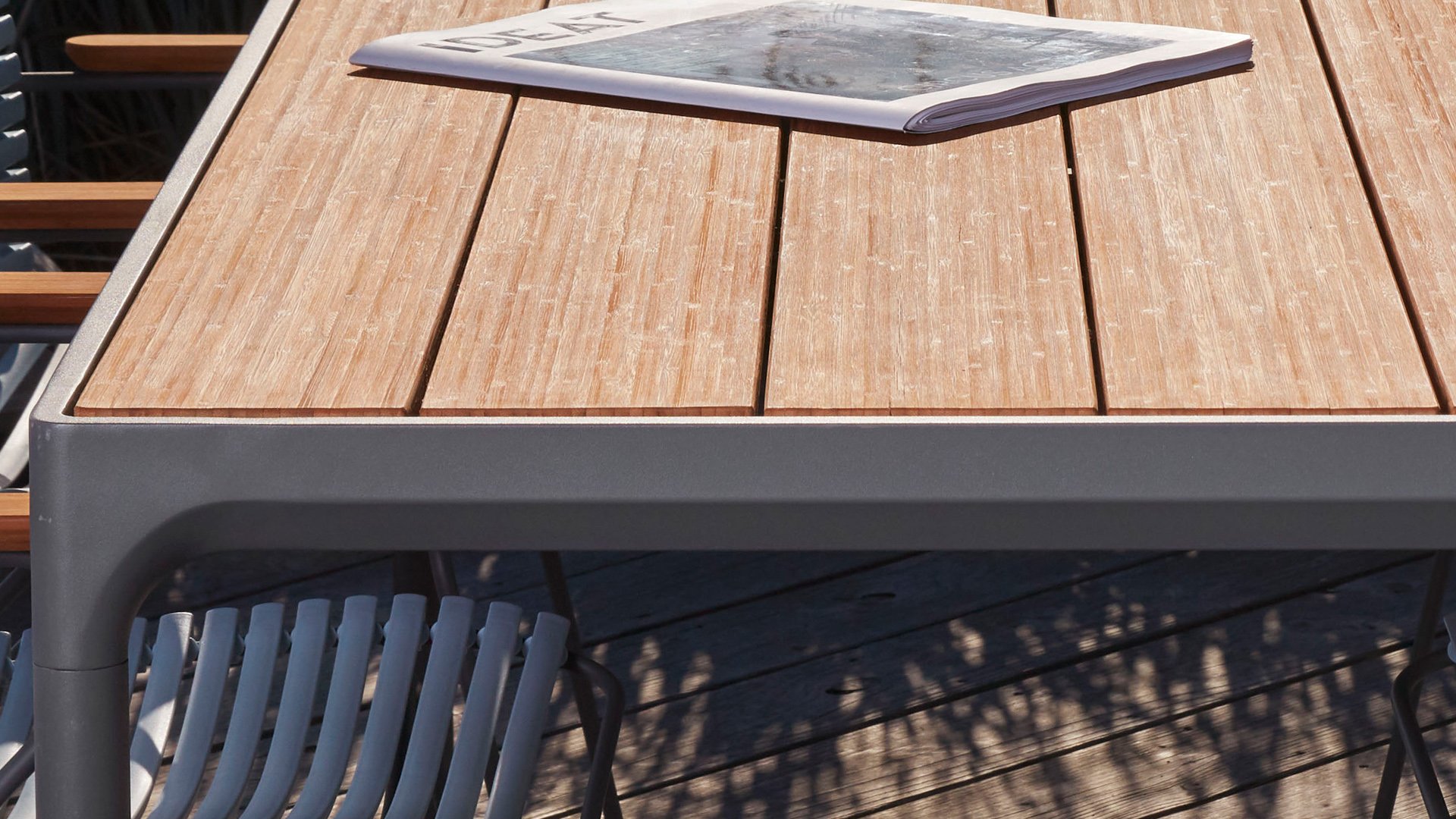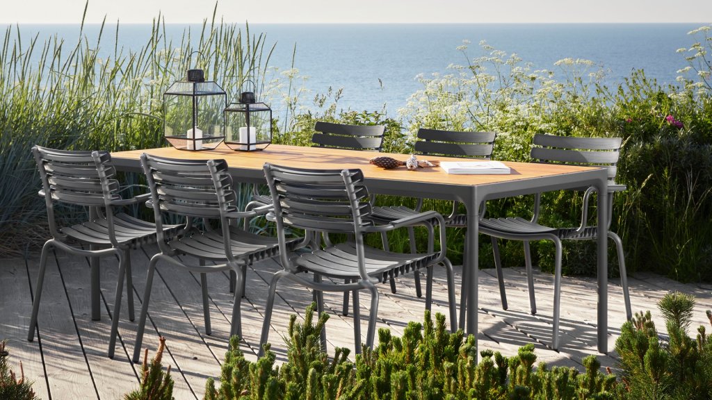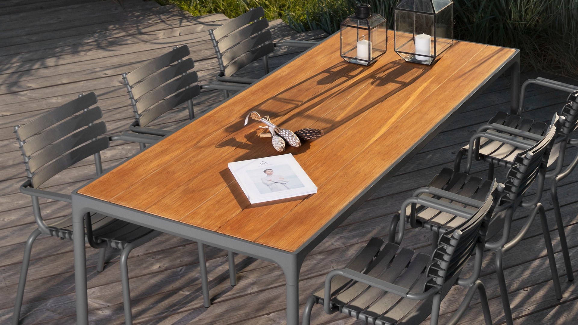Der Four Tisch von Houe ist ein robustes Modell, das gut in ein industrielles Interieur oder ein cooles Interieur passt. Der Tisch ist so konzipiert, dass er Wind und Wetter standhält. Der Tisch Four hat einen stabilen Aluminiumrahmen, der in grau oder schwarz pulverbeschichtet erhältlich ist. Die Bambus-Tischplatte hat eine Struktur, die sich sehr gut für den Außenbereich eignet. Der Tisch kommt in den Maßen mit einer Länge von 90, 160, 210 und 270 cm und hat alle eine Breite von 90 cm und eine Höhe von 74 cm (Stehtisch 111 cm hoch). Bambus ist eine nachhaltigere Alternative zu Teak. Wir empfehlen, den Bambus 2-3 mal im Jahr zu ölen, dann behält der Tisch länger seine warmen Farben.