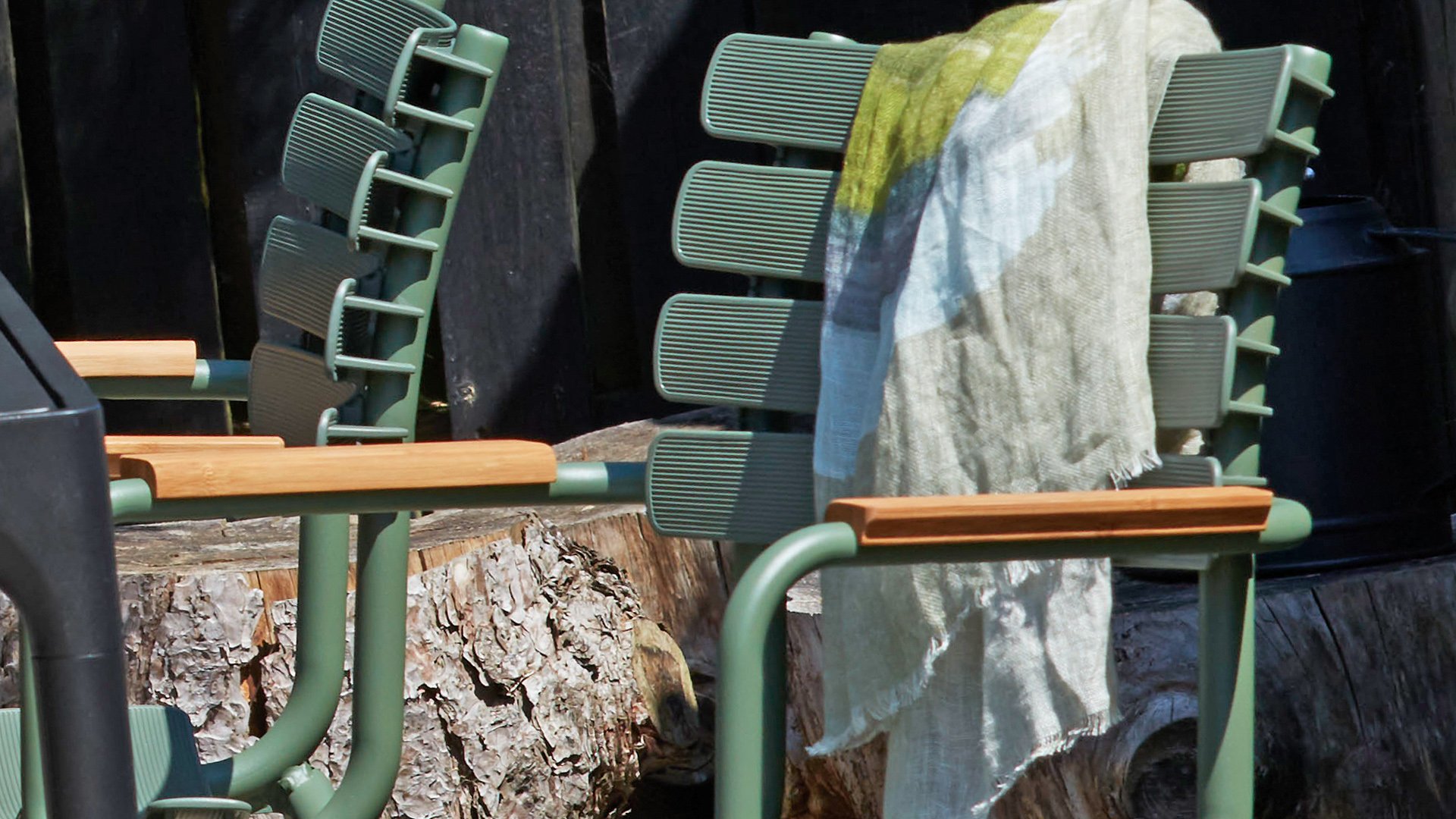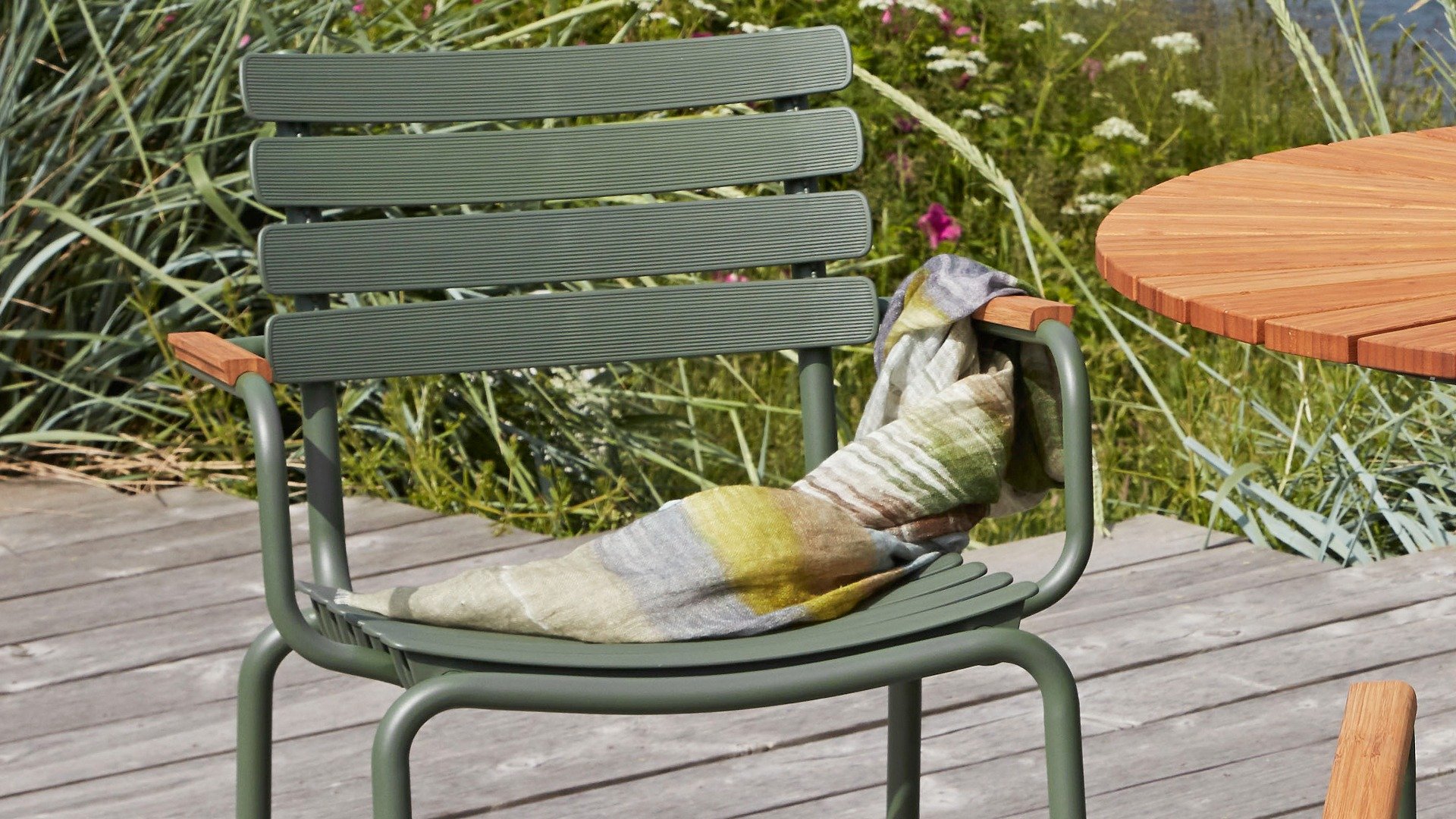 HOUE ReClips Dining collectie: Leichtgewichtiges Design mit minimalistischem Design. Hergestellt aus vollständig recyceltem Kunststoff! Der Gartenstuhl wurde von Henrik Pedersen entworfen, einem dänischen Designer, den wir bereits von dem ikonischen Click! kennen. Erhältlich in 4 Farben, mit Bambus- oder Aluminium-Armlehne.