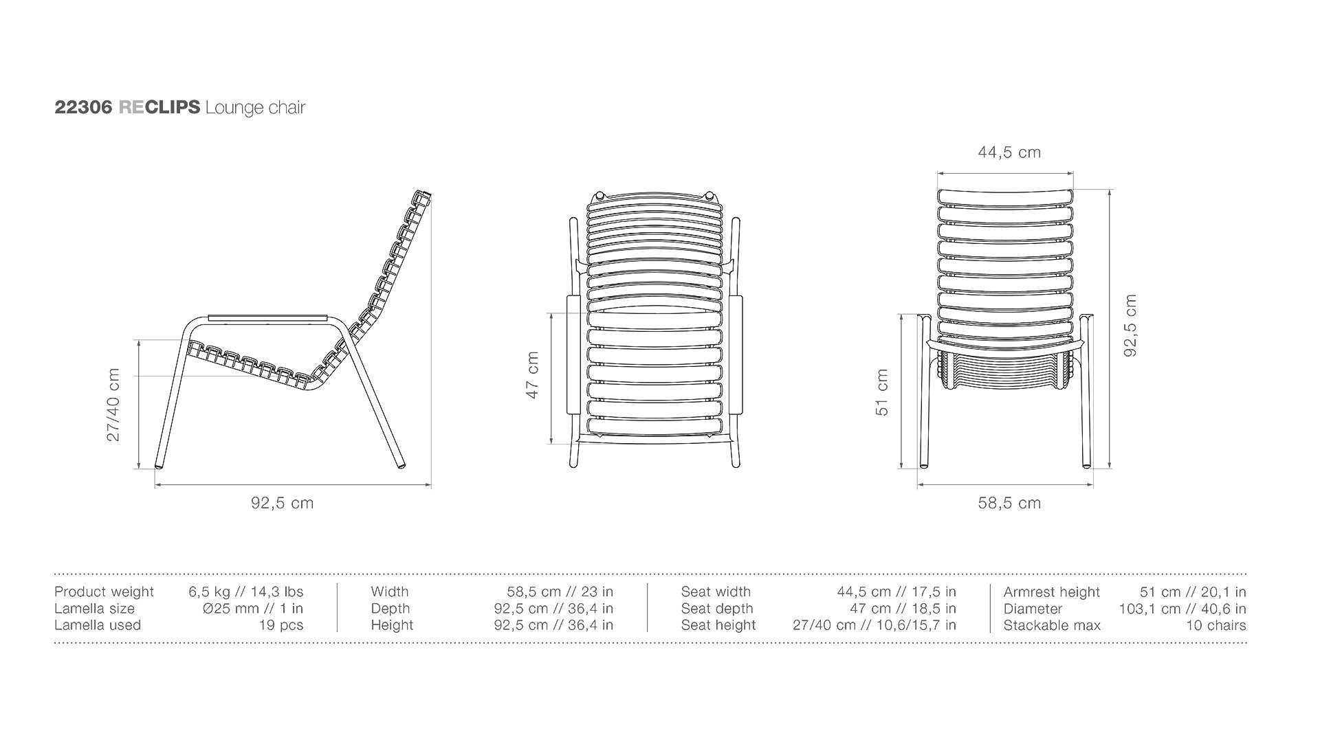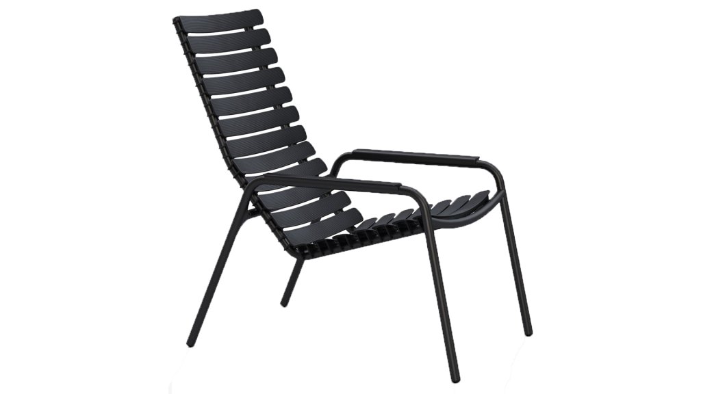 Die HOUE Reclips-Serie besteht aus recyceltem Kunststoff. In Kombination mit dem pulverbeschichteten Aluminiumrahmen ist dies ein pflegefreier Loungesessel. Die ergonomisch geformte Rückenlehne macht den Stuhl sehr komfortabel zu verwenden, ohne Kissen. In dieser Serie sind auch ein Barhocker, Gartenstuhl und ein Schaukelstuhl erhältlich.