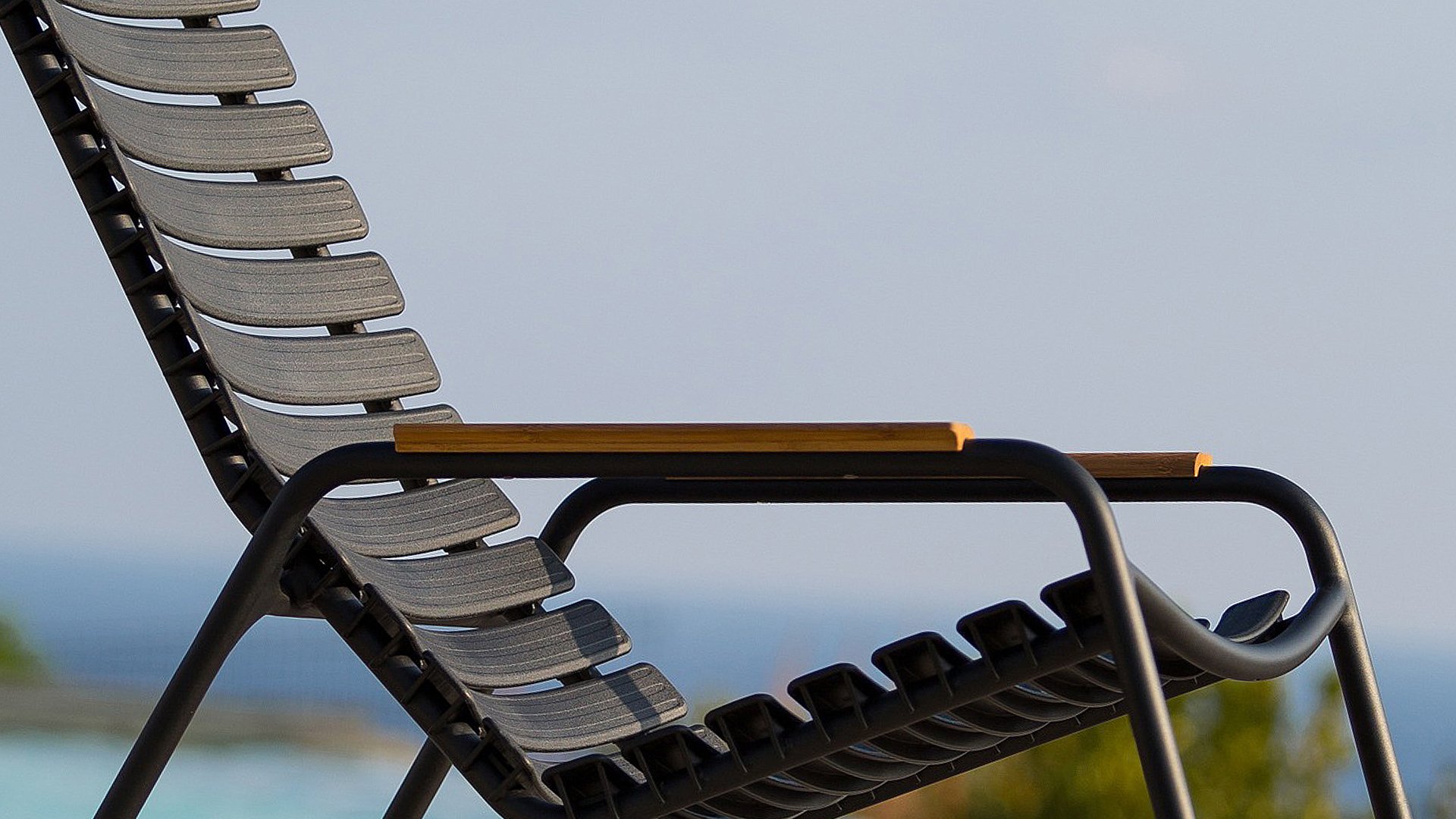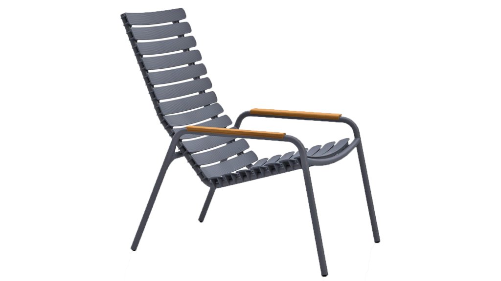 Die HOUE Reclips-Serie besteht aus recyceltem Kunststoff. In Kombination mit dem pulverbeschichteten Aluminiumrahmen ist dies ein pflegefreier Loungesessel. Die ergonomisch geformte Rückenlehne macht den Stuhl sehr komfortabel zu verwenden, ohne Kissen. In dieser Serie sind auch ein Barhocker, Gartenstuhl und ein Schaukelstuhl erhältlich.