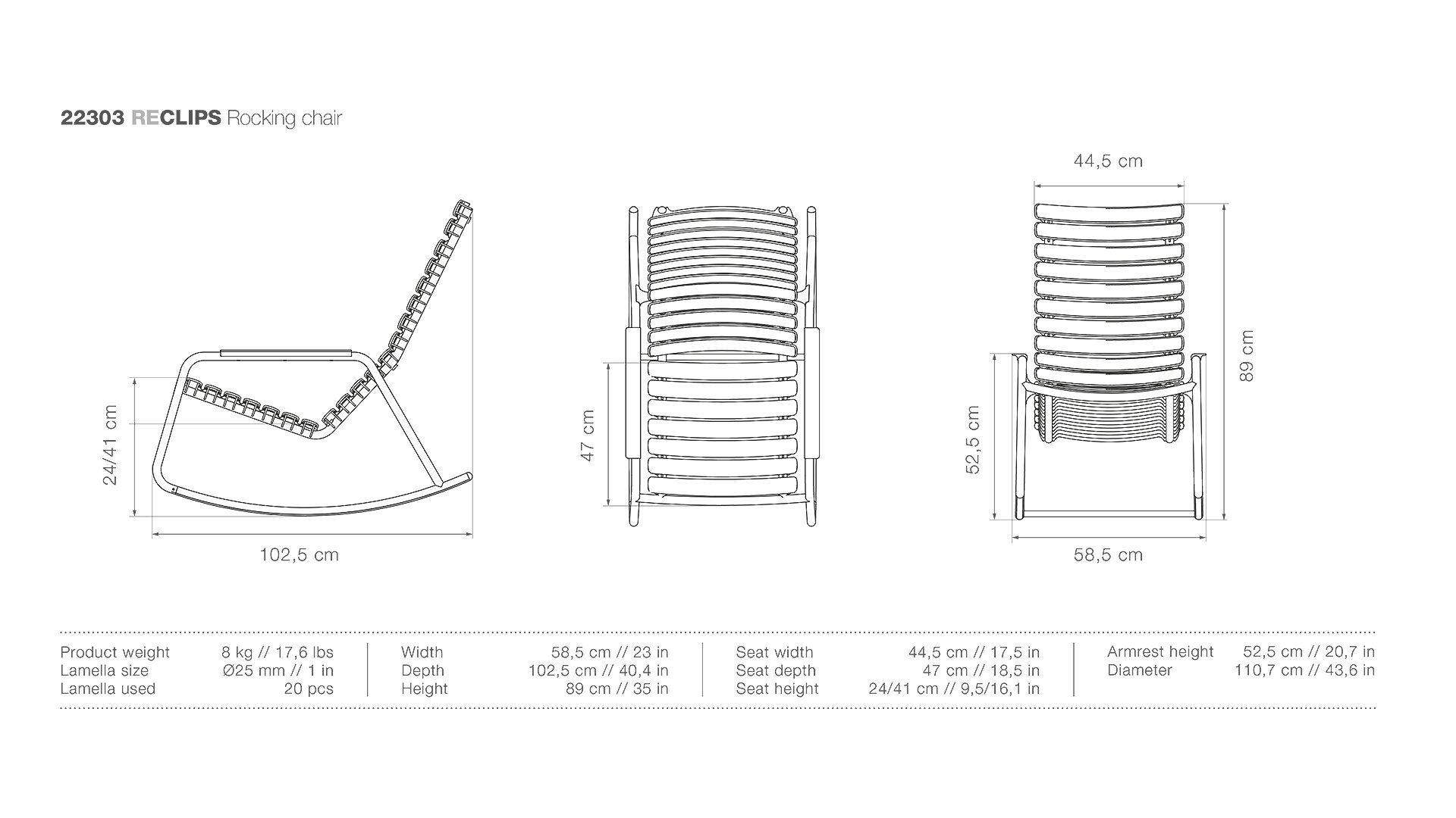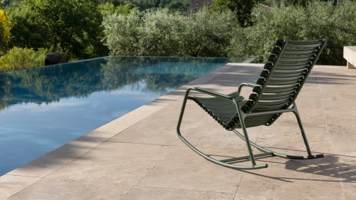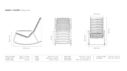 Die HOUE Reclips-Serie besteht aus recyceltem Kunststoff. In Kombination mit dem pulverbeschichteten Aluminiumrahmen ist dies ein pflegefreier Loungesessel. Die ergonomisch geformte Rückenlehne macht den Stuhl sehr komfortabel zu verwenden, ohne Kissen. In dieser Serie sind auch ein Barhocker, Gartenstuhl und ein Schaukelstuhl erhältlich.