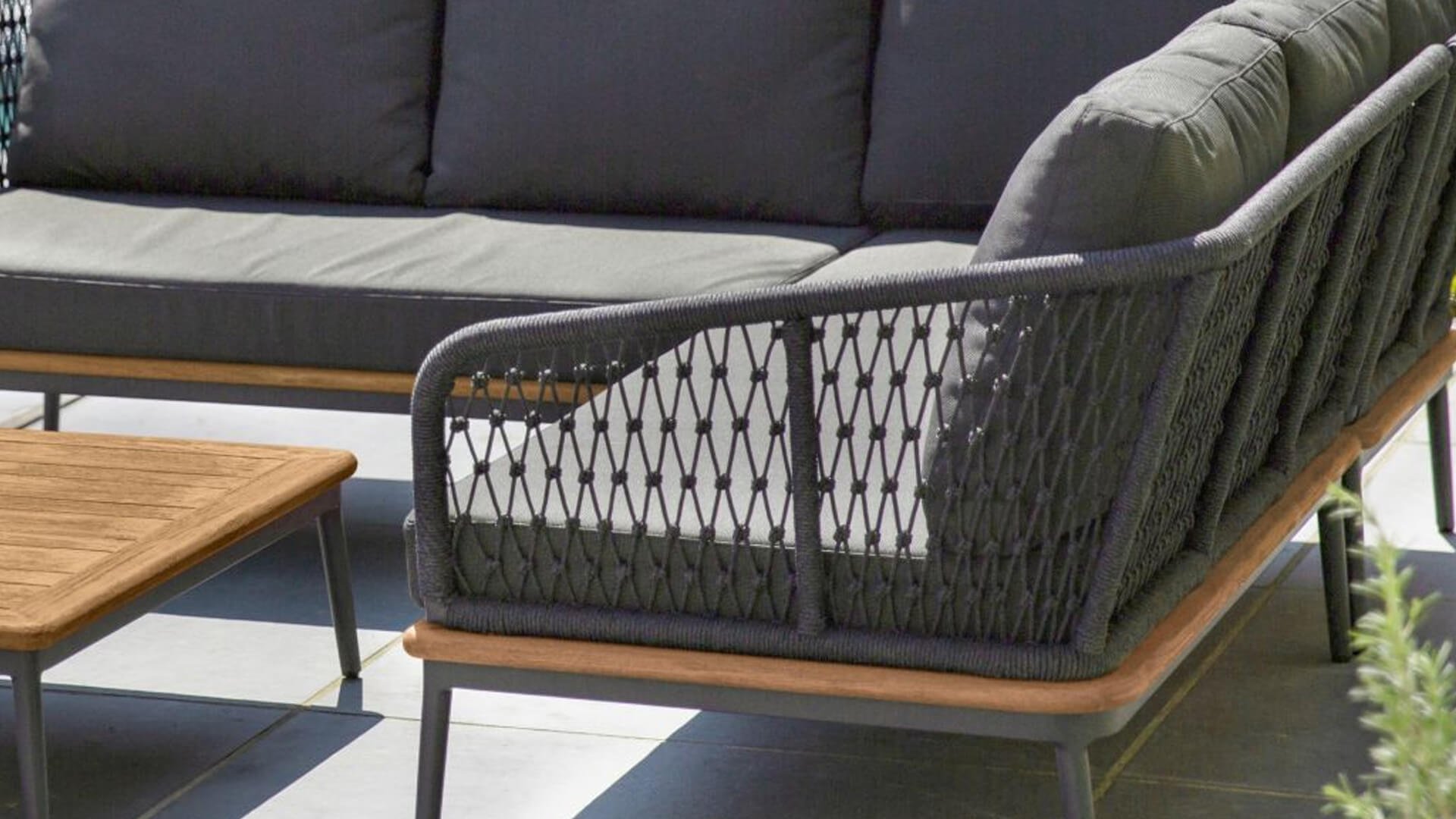 Comfortabele bekleding, moderne rugleuningen met gevlochten koorden en accentuerende teakhouten elementen kenmerken het moderne design van Niehoff FREEPORT. De loungegroep FREEPORT kenmerkt zich vooral door de comfortabele bekleding. Deze bestaan uit het innovatieve Quick Dry®-schuim, dat bijzonder snel droogt en daardoor ook geschikt is voor buiten.