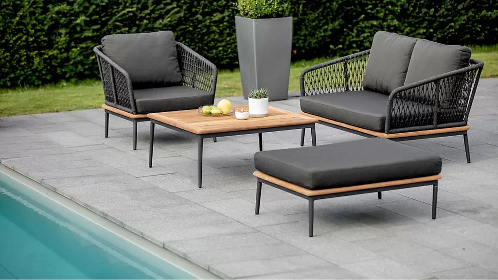 | Materialien Loungegruppe | Rope, Teak, Pulverbeschichtet Aluminium/Stahl |