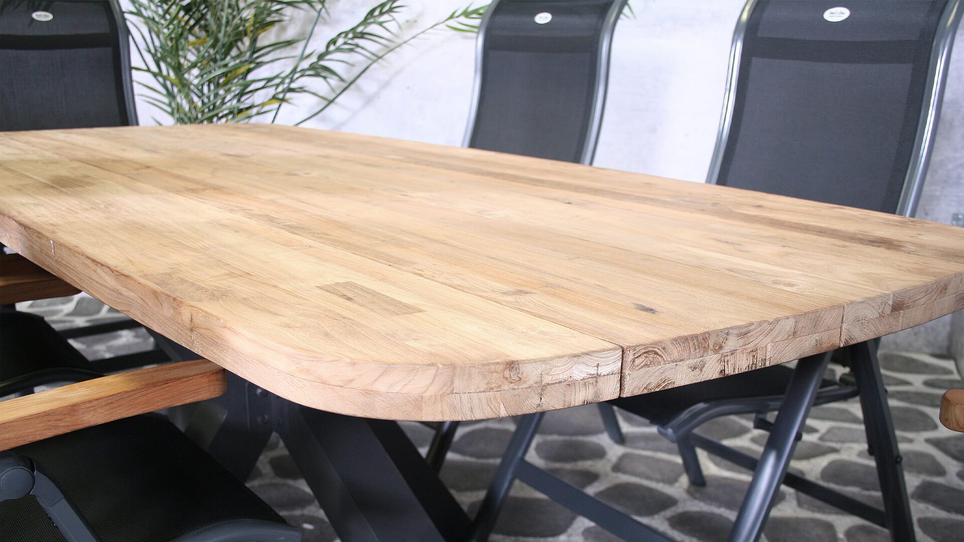 SenS-Tische werden aus recyceltem Teakholz hergestellt. Das bedeutet, dass jeder Tisch ein Unikat ist. Es verleiht der Tischplatte ein robustes Aussehen. Bitte beachten Sie, dass Teakholz aufgrund von Verwitterung funktioniert. Unvollkommenheiten und Unregelmäßigkeiten sind kennzeichnend für dieses Produkt.
