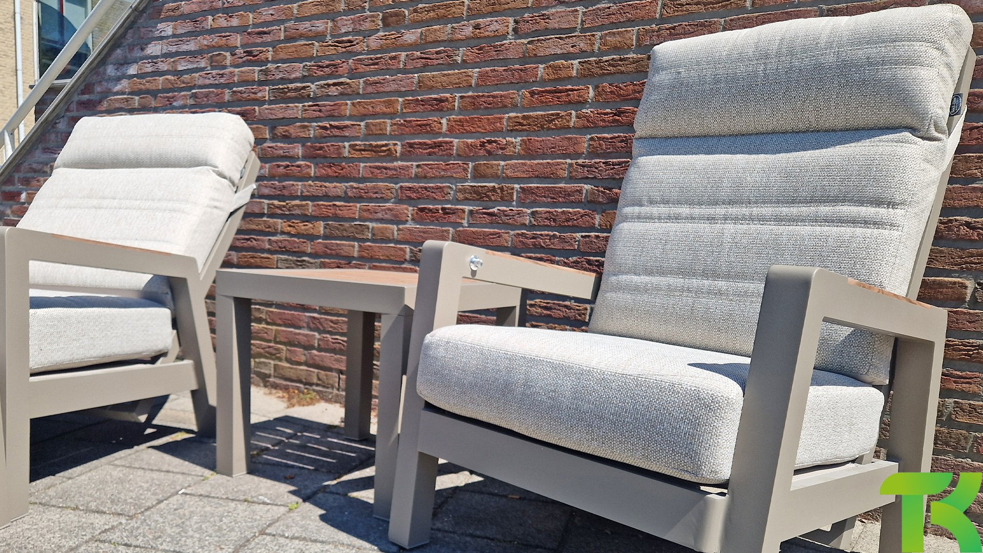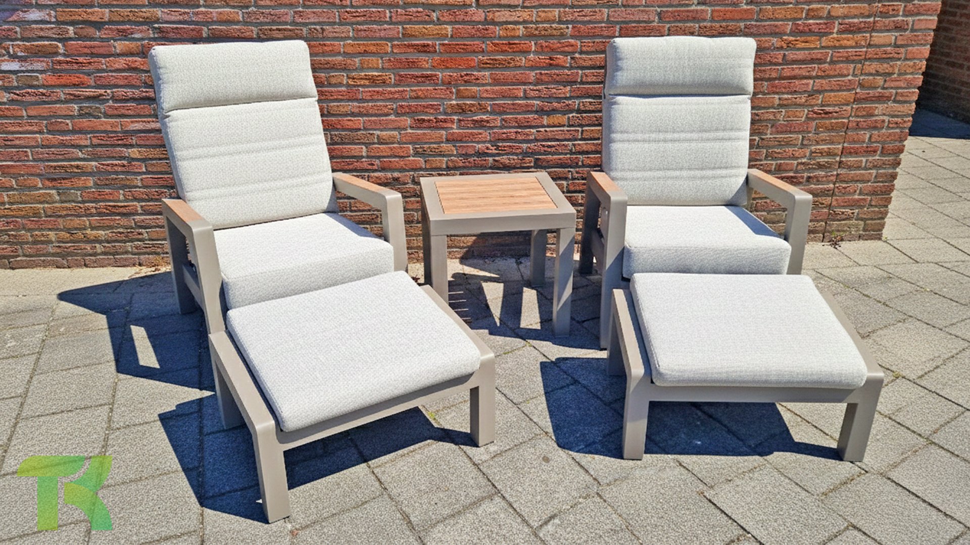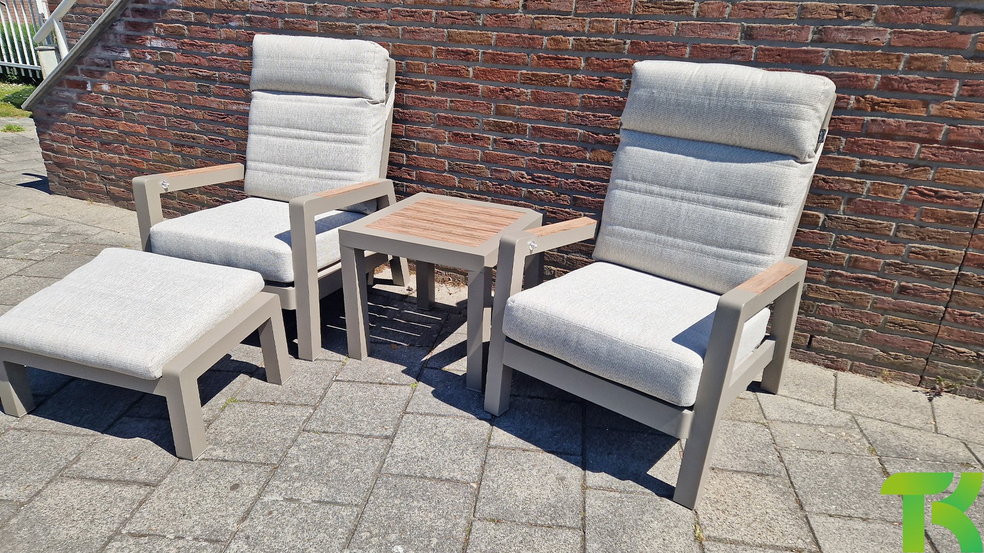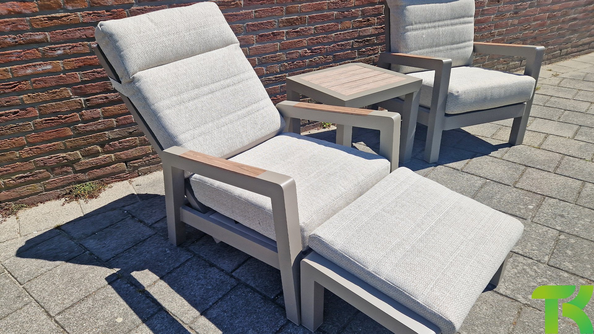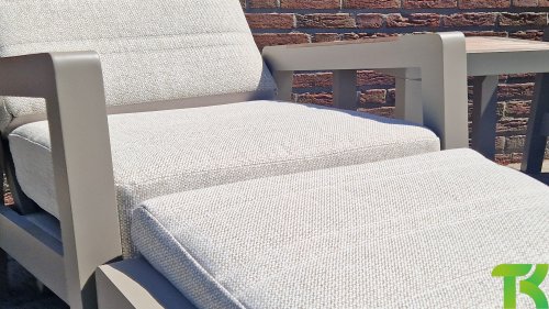 Das Set besteht aus zwei Loungesesseln, zwei Fußhockern und einem praktischen Beistelltisch, die zusammen eine vollständige und praktische Sitzecke bilden. Jeder der Loungesessel ist mit Olefin-Sitzkissen ausgestattet, wobei die Rückenlehnen der Loungesessel über einen Knopf in der Armlehne verstellbar sind. Auf diese Weise können Sie ganz einfach die ideale Sitzposition für zusätzlichen Komfort und Entspannung wählen. Der Beistelltisch des Sets verfügt über eine Tischplatte in Holzoptik, die dem Set eine natürliche Ausstrahlung verleiht und perfekt zum modernen Design der anderen Möbelstücke passt. Die Holzoptik-Tischplatte ist zudem pflegeleicht, was sie praktisch für den Außenbereich macht.