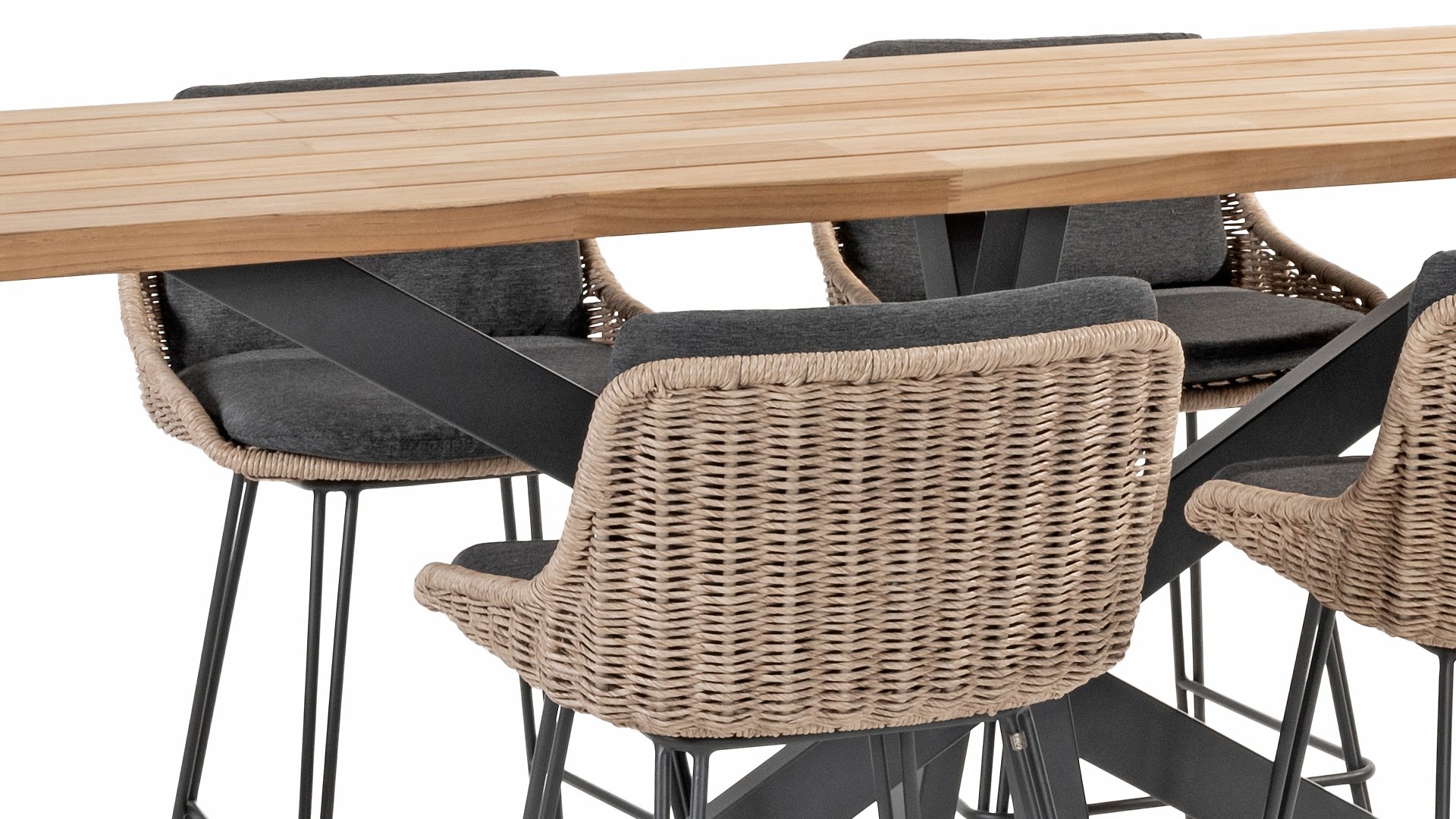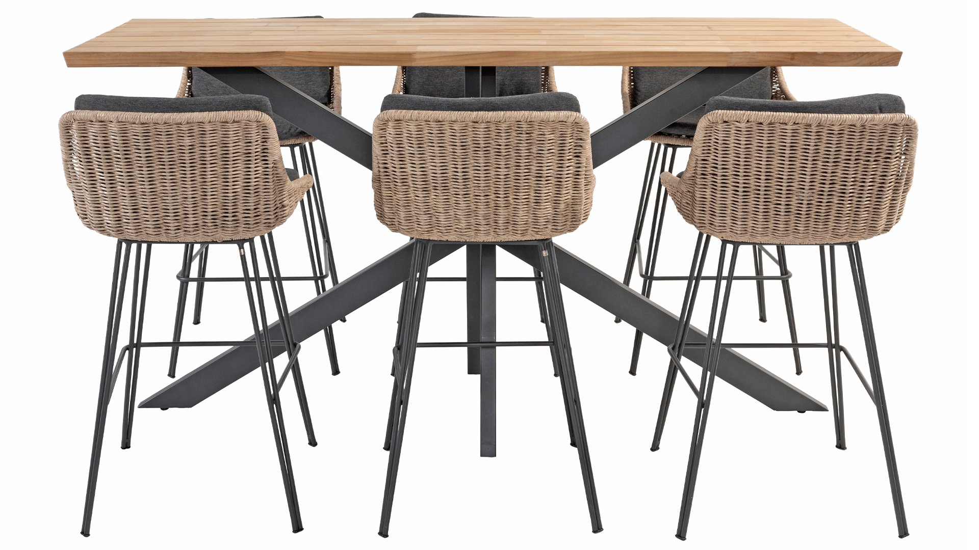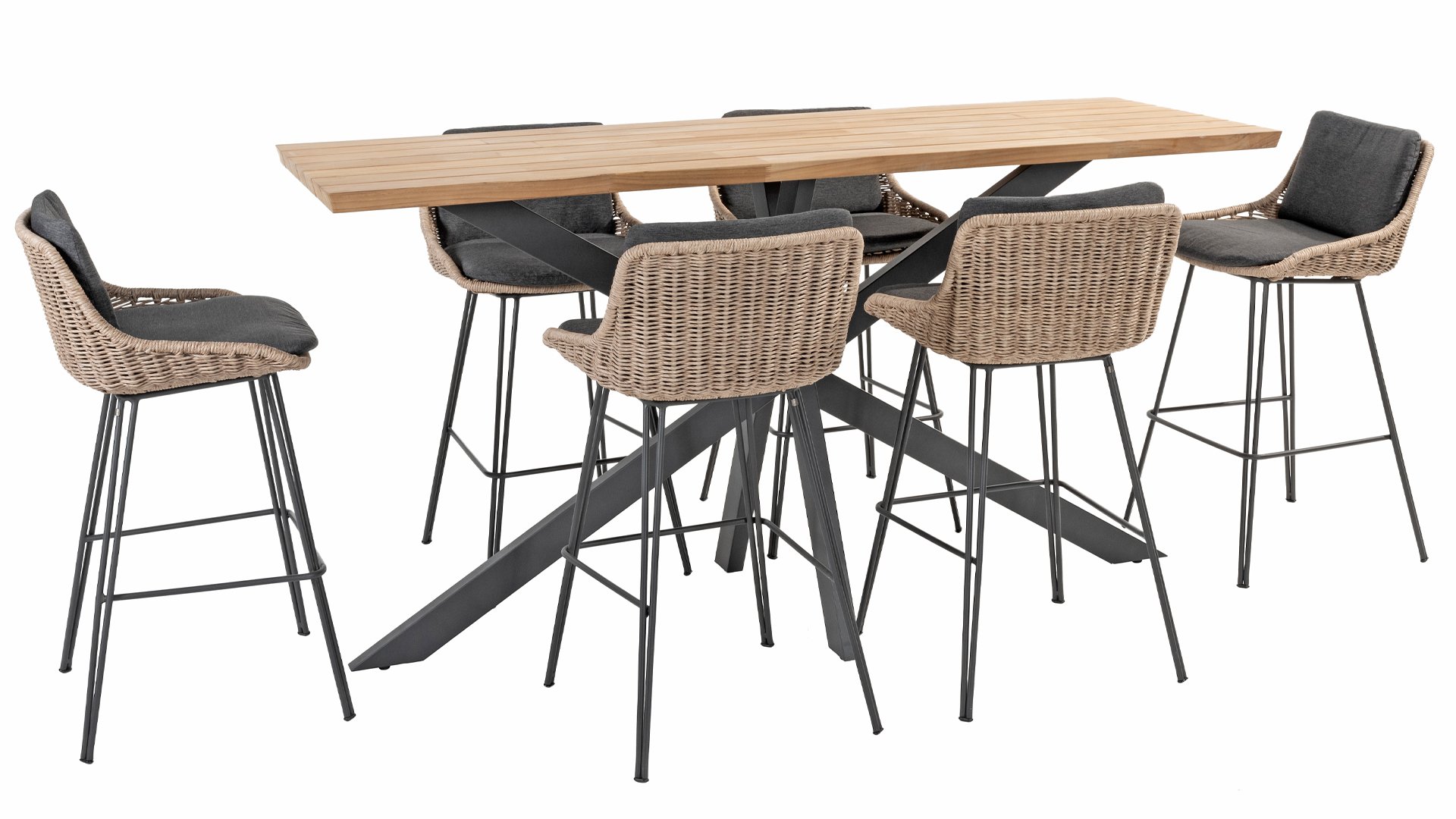 Eine hohe Essgruppe sorgt für Gemütlichkeit. Der Teak-Stehtisch Taste 4SO Prado hat ein raffiniertes Design mit einem auffälligen pulverbeschichteten Edelstahlgestell in der Farbe Anthrazit. Das schlanke Kreuzbeingestell verleiht diesem Tisch ein zeitgemäßes und modernes Aussehen. Dank des praktischen Kreuzbeingestells stehen die Stühle frei am Tisch, ohne dass sie durch ein Tischbein behindert werden. Der Bartisch Prado ist für sechs Personen geeignet.