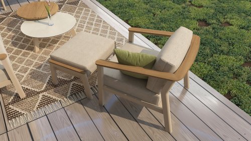 Die Latte-Farbe lässt sich wunderbar mit Teakholz kombinieren, daher wurde eine Teakholz-Veredelung gewählt. Die Armlehnen verlaufen bis zur Rückseite des Rahmens.