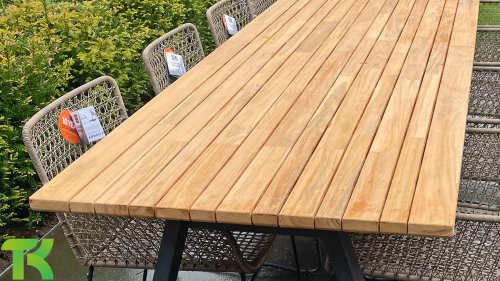 Der Teakholztisch Ambassador ist ein beliebtes Modell innerhalb des schönen Sortiments von Taste 4SO. Ambassador Tischen. Ein auffälliges Detail der Teakholzplatte des Ambassador-Tisches sind die verschiedenen Breiten der Dielen. Auf den Detailfotos ist dieser schöne Effekt gut sichtbar. Es sorgt für einen originellen und zeitgemäßen Look. Das Gestell ist aus pulverbeschichtetem Edelstahl gefertigt.