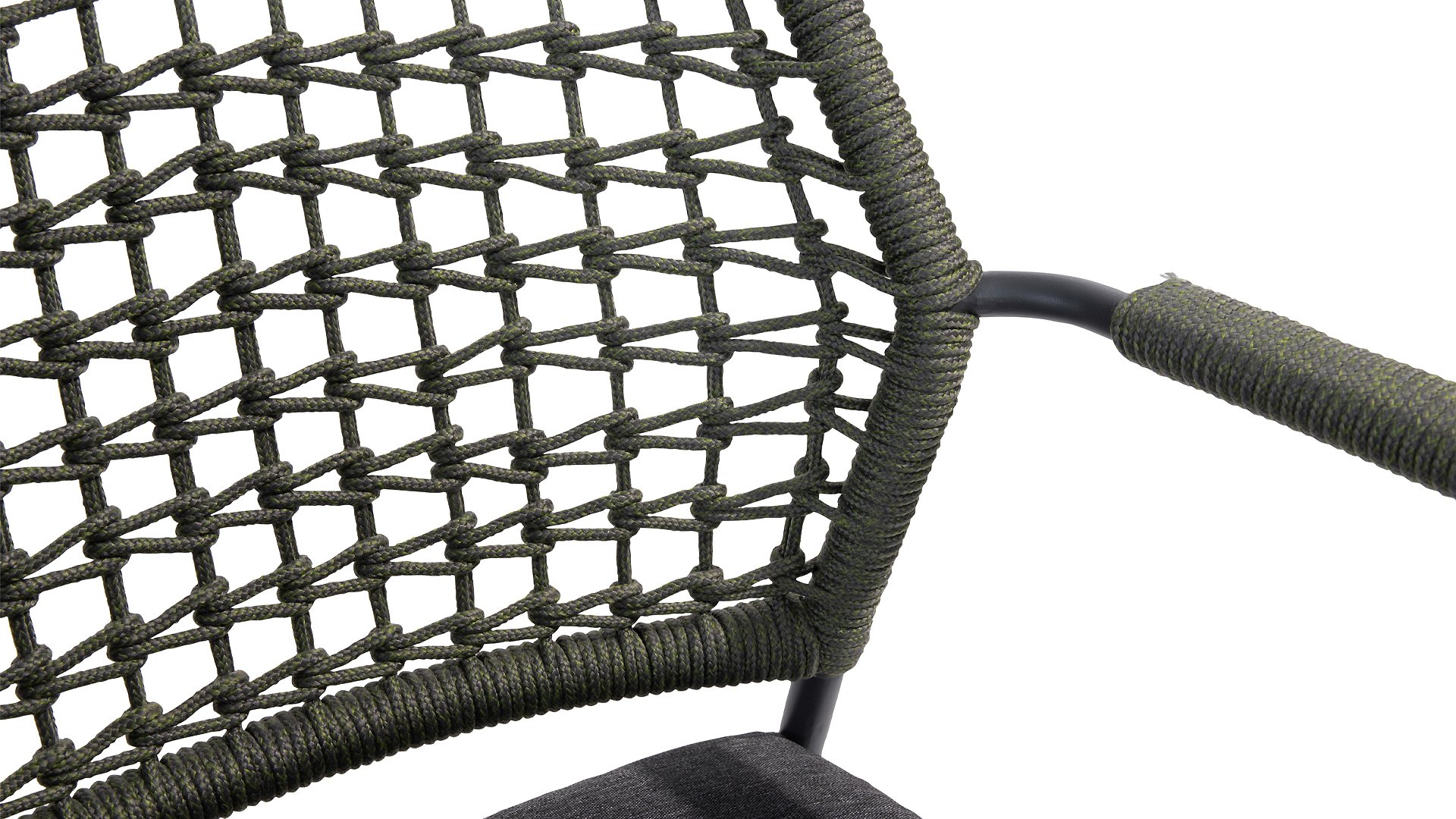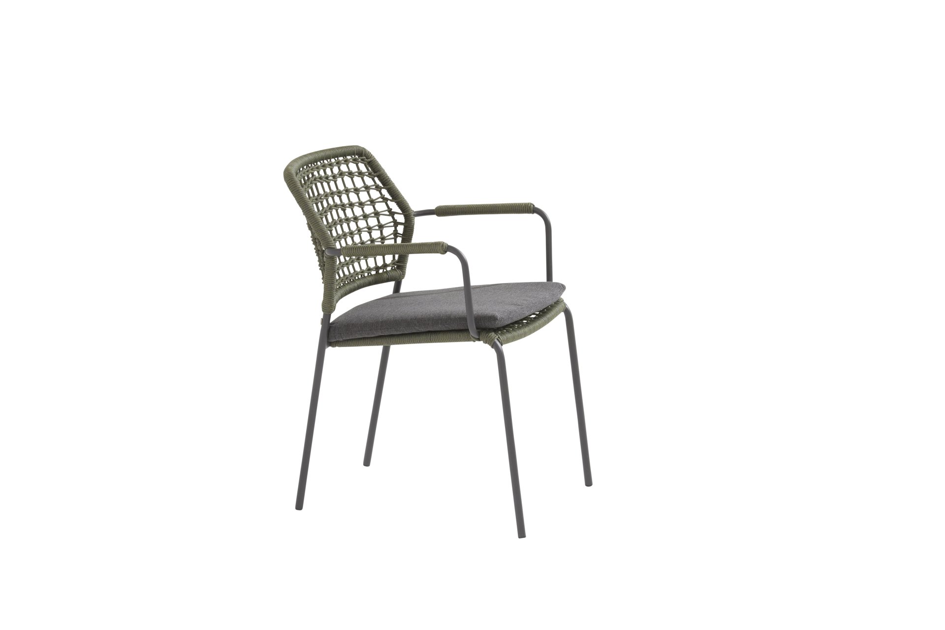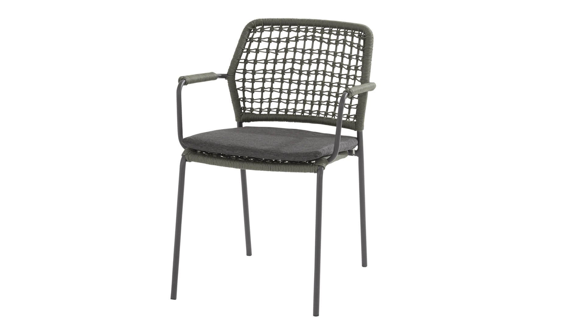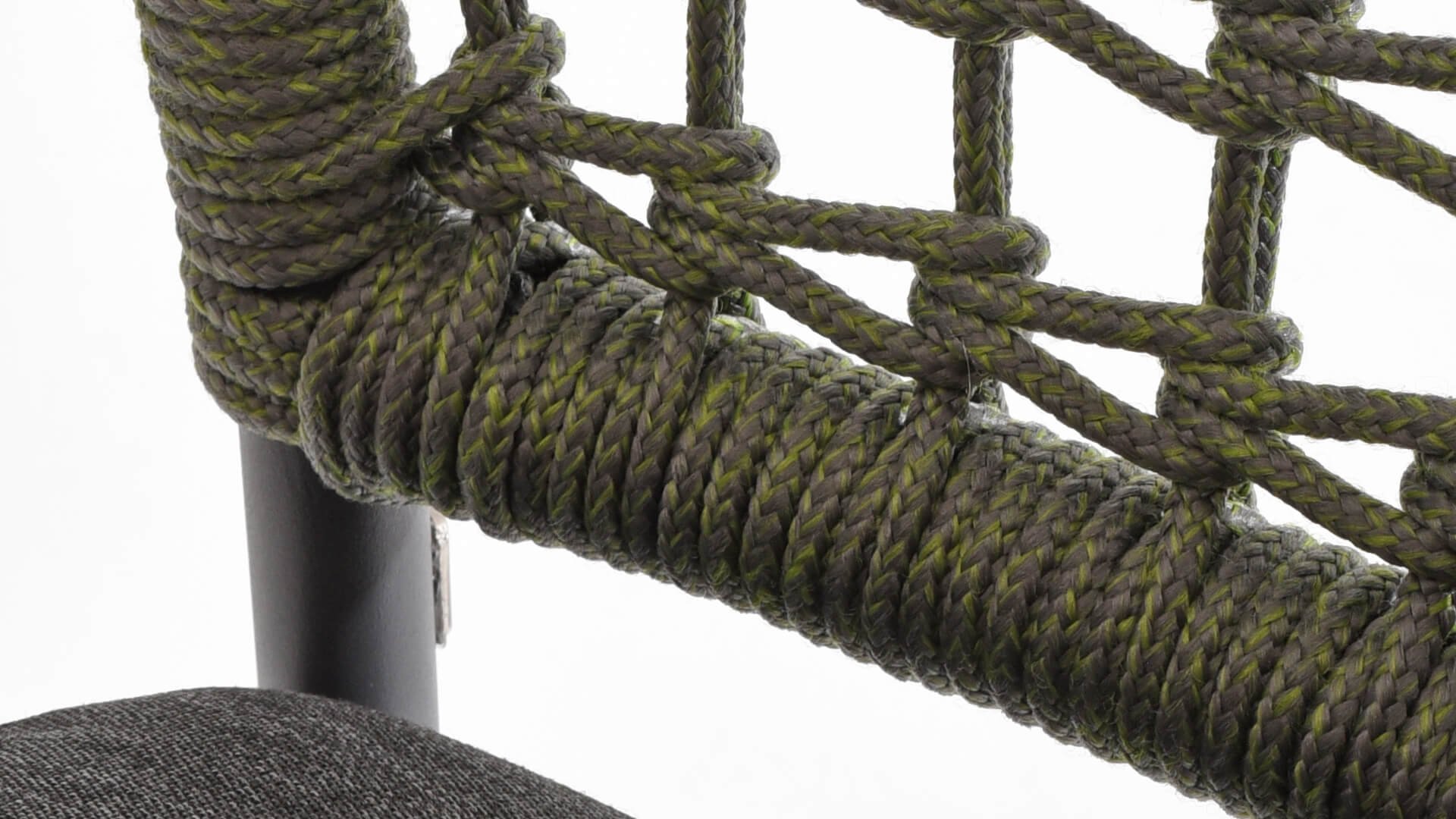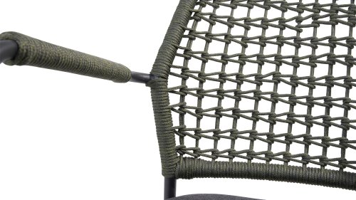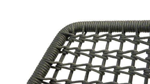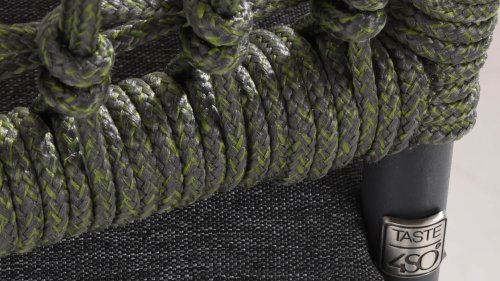 Dieser Stuhl ist in 5 Tau-Farben erhältlich: Antraciet, Grün, Blau, Frozen und Latte. Sie betrachten hier die Antraciet-Variante. Sie können also auswählen, welche Farbe am besten auf Ihrer Terrasse passt, oder eine schöne Kombination aus 2 oder sogar 5 Farben erstellen. Das Tau-Material ist wetterfest und in einem Blockmuster geknotet. Das Tau kehrt subtil in den Armlehnen zurück.