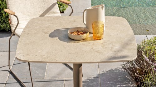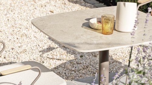 Dieser Tisch mit einer Größe von 75x75 cm verfügt über eine elegante Keramikplatte, die sowohl stilvoll als auch praktisch ist. Die Keramik ist nicht nur langlebig und leicht zu reinigen, sondern verleiht auch ein luxuriöses Aussehen. Das Gestell ist in einem warmen, erdigen Farbton namens terre gehalten, der perfekt zu modernen und rustikalen Innenräumen/Gärten passt.