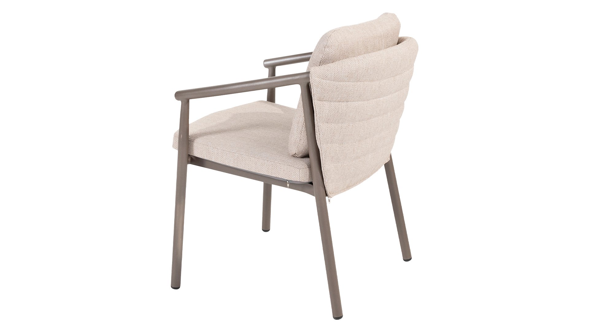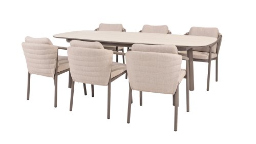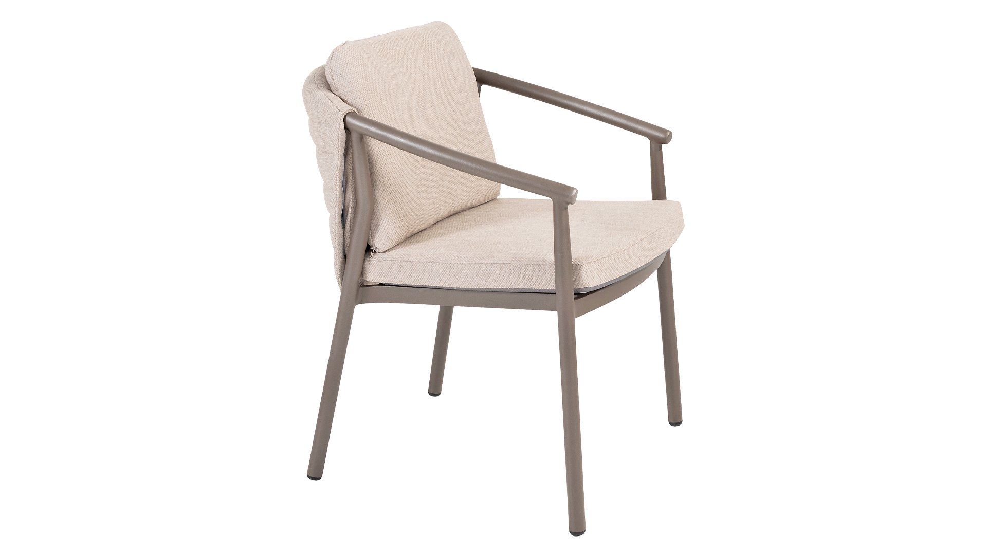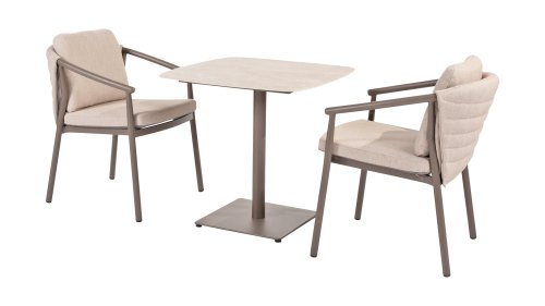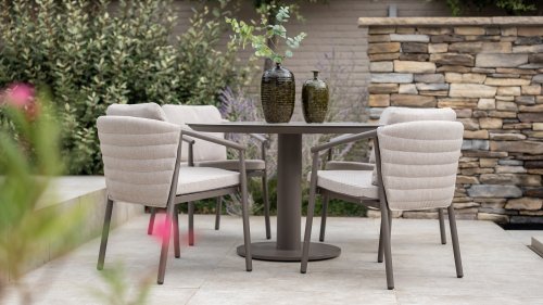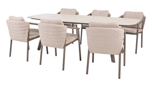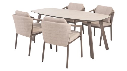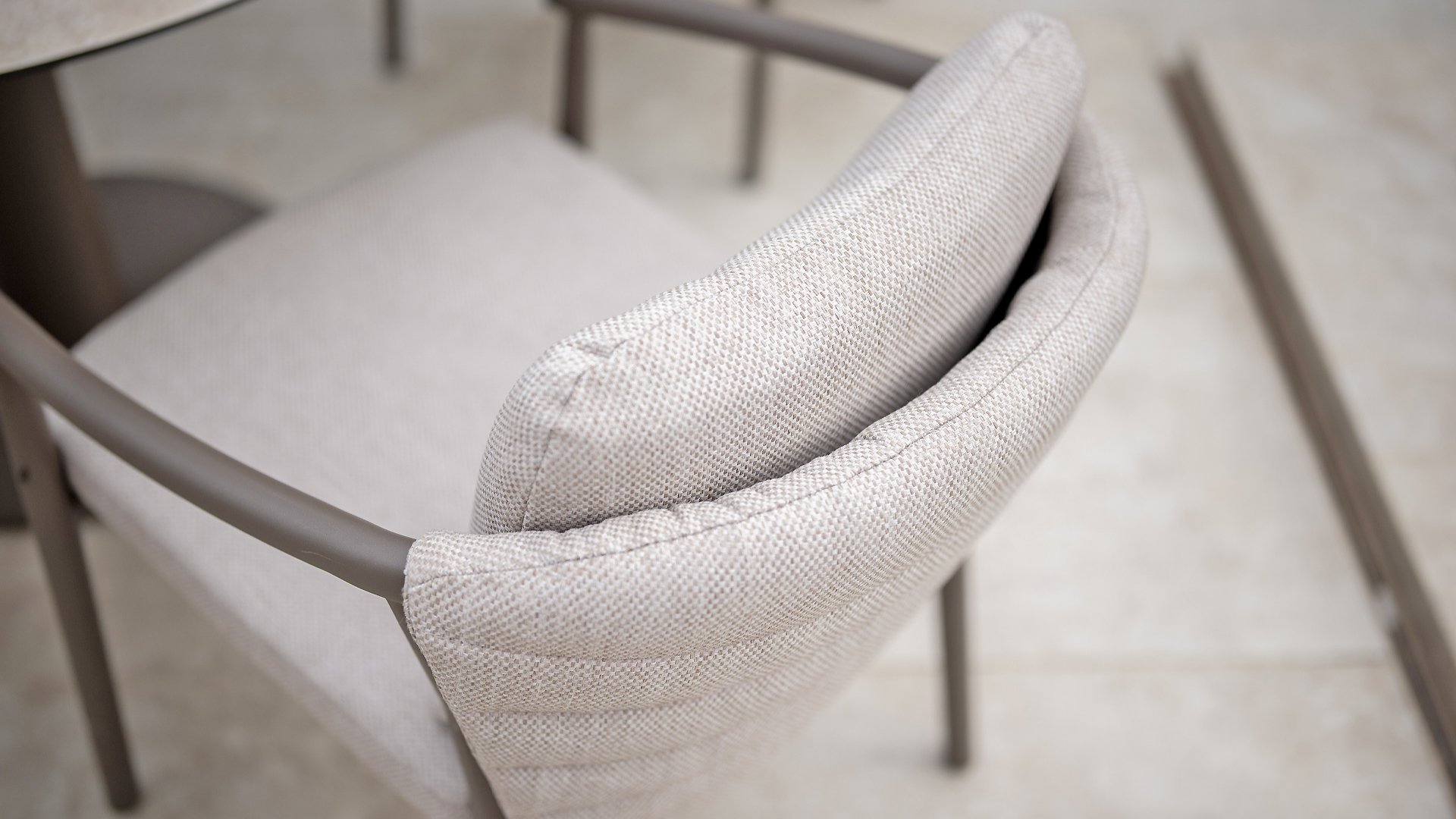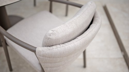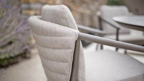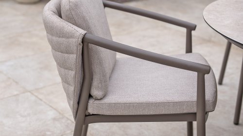 Der Taste 4SO Barolo ist einzigartig. Die gesteppte Rückenlehne verleiht dem Stuhl sein unverwechselbares Aussehen und bietet wunderbar weichen Sitzkomfort. In Kombination mit dem eleganten, pulverbeschichteten Aluminiumgestell „Terre“ und dem stilvollen grauen Seil, das die Kissen umgibt, schafft der Stuhl eine ruhige und stilvolle Optik, die perfekt in jeden modernen Garten passt. Die hellgrauen Kissen runden das Gesamtbild ab und laden zu langen, gemütlichen Abenden im Freien ein. Neben dem Gartenmöbelset ist in dieser Serie auch ein Lounge-Set erhältlich, um das Outdoor-Erlebnis abzurunden.
